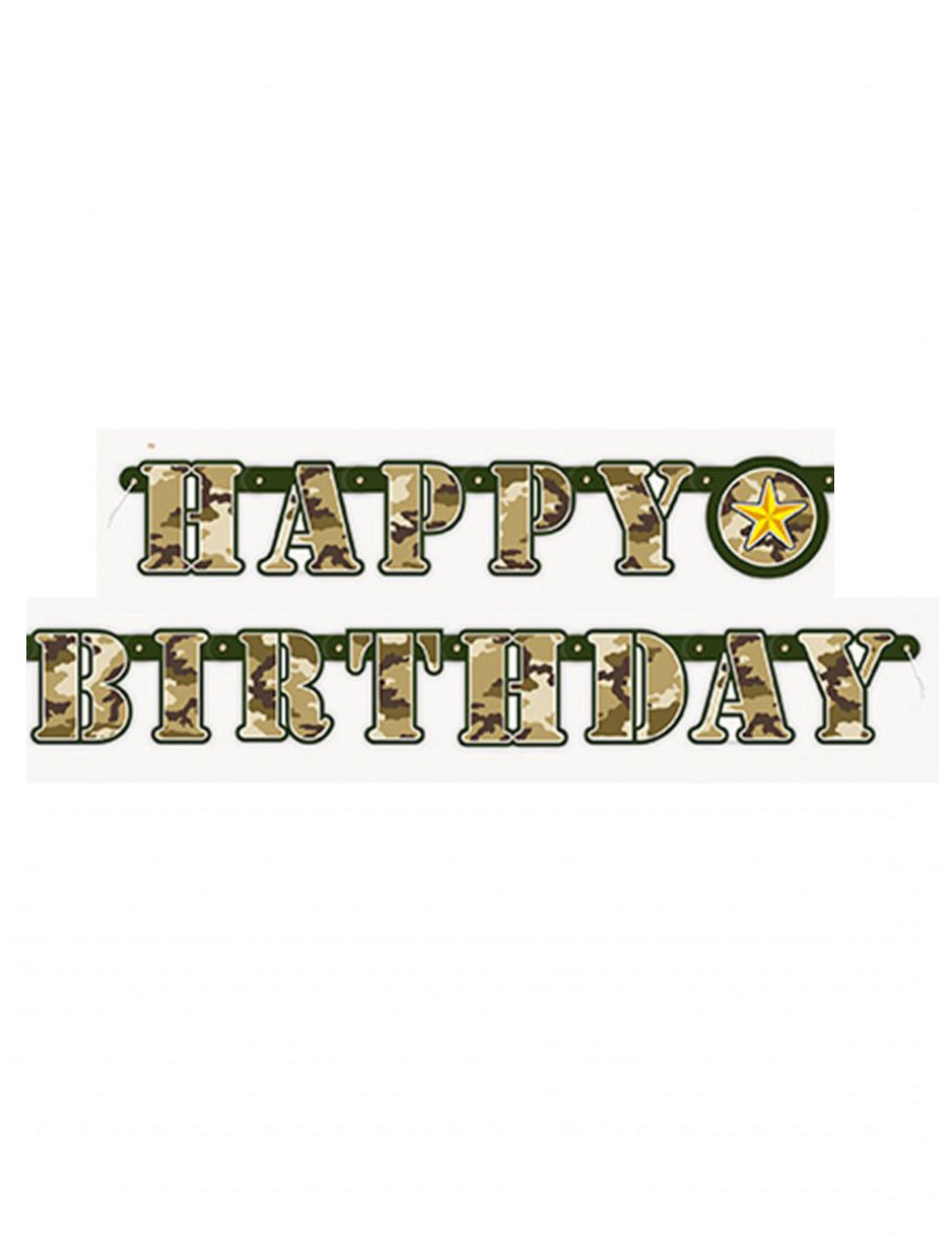 Ovaj artikulirani vijenac izrađen je od kartona. Mjeri približno 1,6 m duljine. Sastoji se od pisma koje tvori poruku "Sretan rođendan", s kamuflažnim tiskom. Ficeli su prisutni sa svake strane vijenca kako bi ga lako objesili. Ovaj će vijenac biti savršen za dovršavanje vašeg ukrašavanja rođendana na vojnu temu.