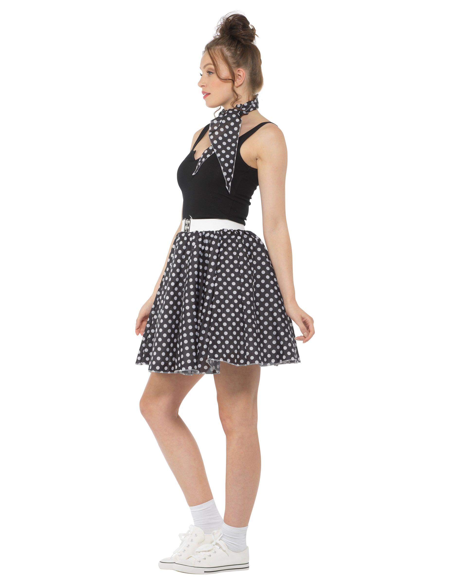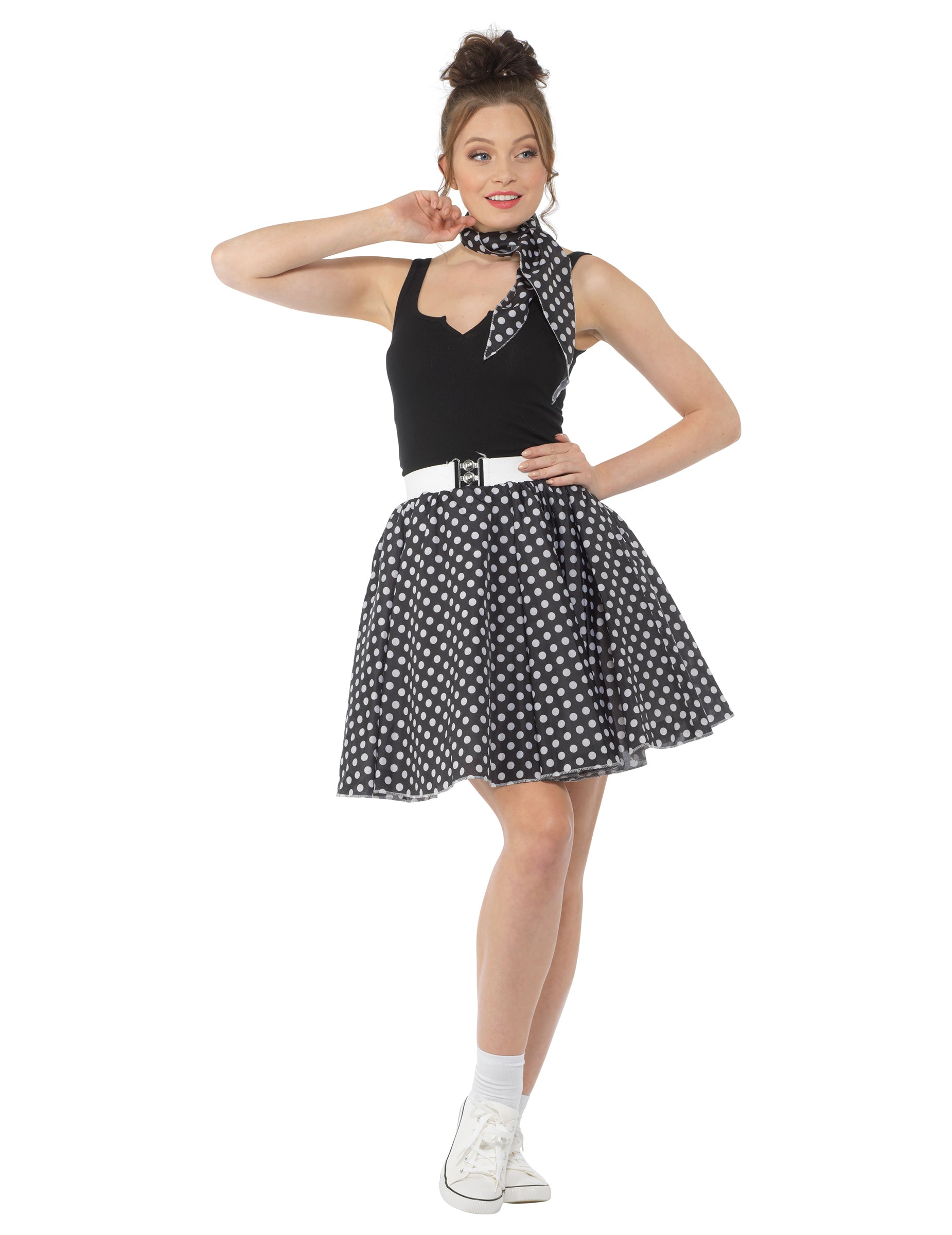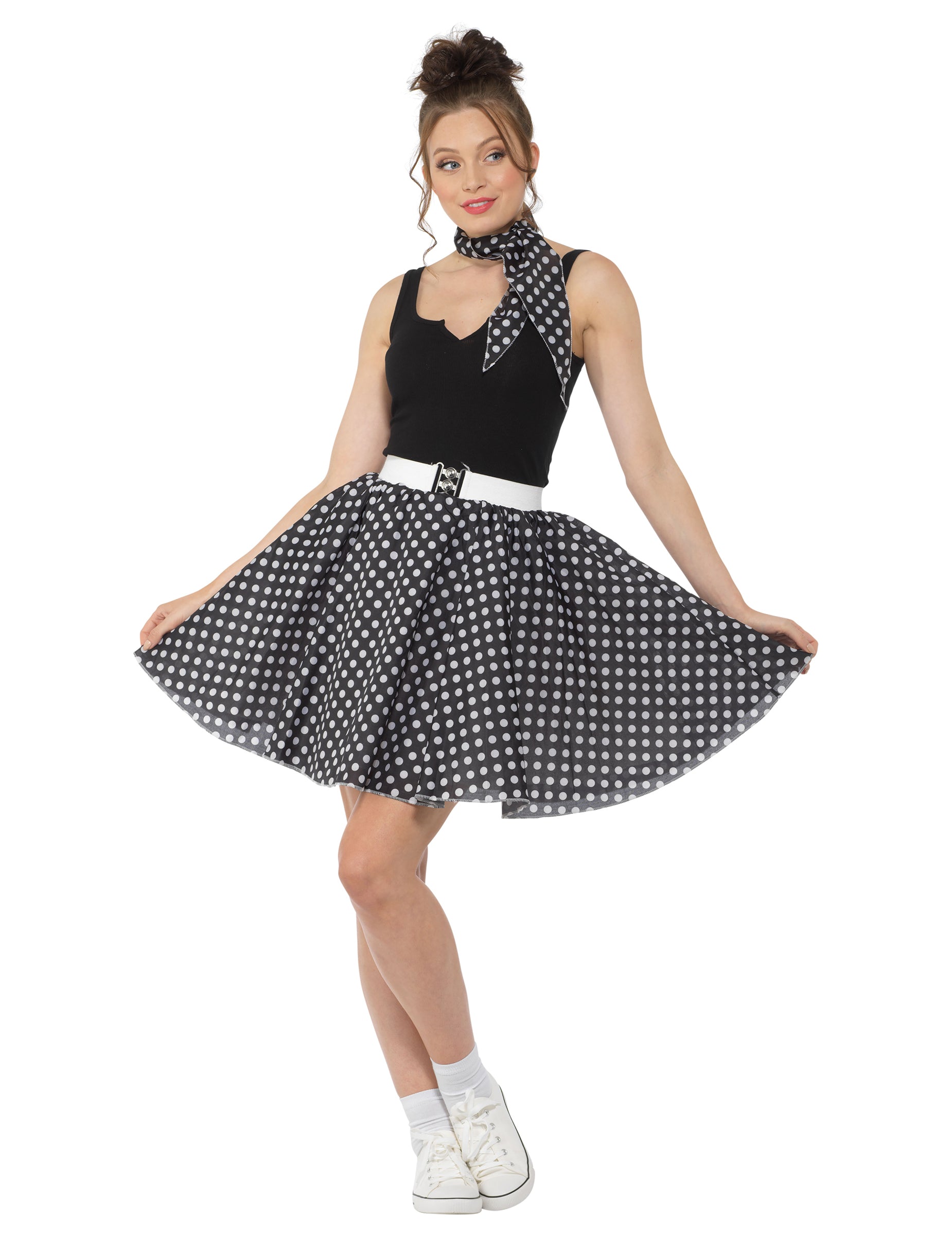 Ovaj kostim iz 1950 -ih za žene sastoji se od suknje i bandane (visoke i cipele nisu uključene). Izbrijana suknja je crna s bijelim točkicama. Elastični remen šiva se izravno u struku. Zatvara se srebrnom metalnom petljom. Crni šal s bijelim polka točkicama dovršava ovu lijepu odjeću. Ovaj retro set bit će savršen za sudjelovanje u temi 1950 -ih.