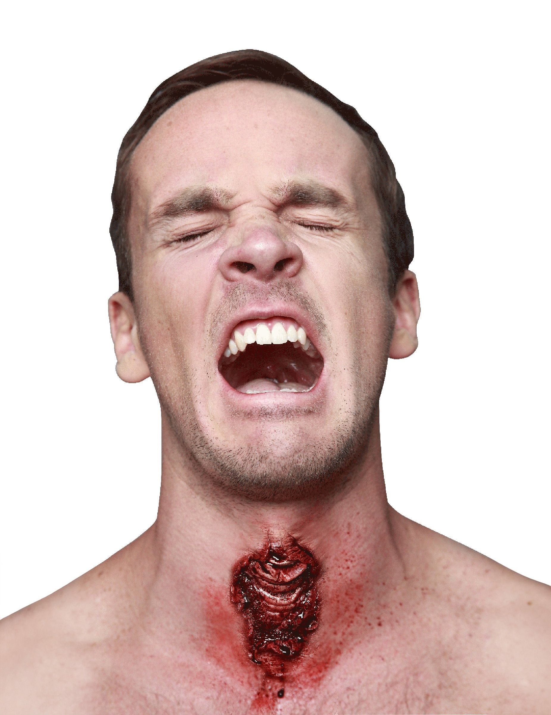 Ova lažna rana namijenjena je odraslima i mjeri otprilike 8,5 x 5,5 cm. Njegovi fleksibilni lateks i nevjerojatni detalji nude nevjerojatan realizam! Ozljeda daje iluziju grla otkrivenog s prividnom travnjakom i kožom potpuno otkinuto! Za nevjerojatan rezultat, ništa ne može biti jednostavnije: na ranu nanesite ljepilo ili šminku (nije uključeno) i stavite je na grlo! Za još prirodniji učinak, konture izmislite bež i crvene kreme! Izbjegavajte jesti previše začinjeno ili će vam traheja napraviti svoje! Preferirajte bombone do večeri za Noć vještica!