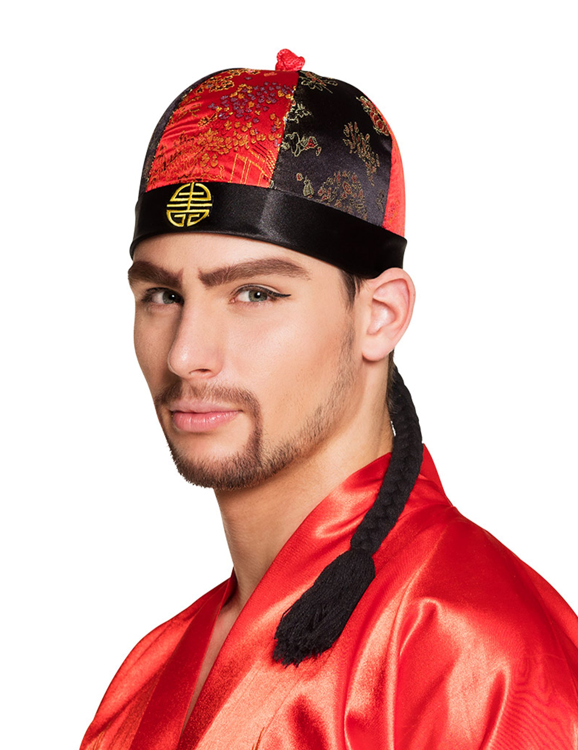 Ova kineska pokrivačica je crna i crvena. Podnožje kapice je saten i ukrašen na prednjem dijelu zlatnog kineskog simbola i na stražnjoj strani crne pletenice. Na kapu je mnoštvo kineskih crteža u zlatu, plavom i crvenom. Naglavlje ima toranj glave od oko 58 cm. Ovaj dodatak savršen je za igranje sjajnog kineskog gospodara tijekom kineske nove godine, na primjer ili za vrijeme karnevala.