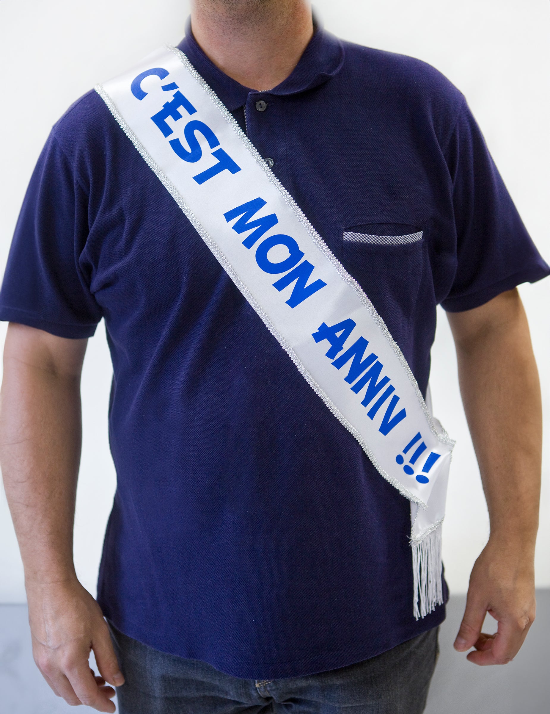 Ovaj šal dugačak oko 150 cm i širok 10 cm je za odrasle. Izrađena je od satenske bijele tkanine s obrubnim i srebrnim rubovima s natpisom "To je moj rođendan !!!" Ovaj će šal biti osnovni dodatak vašoj rođendanskoj zabavi.