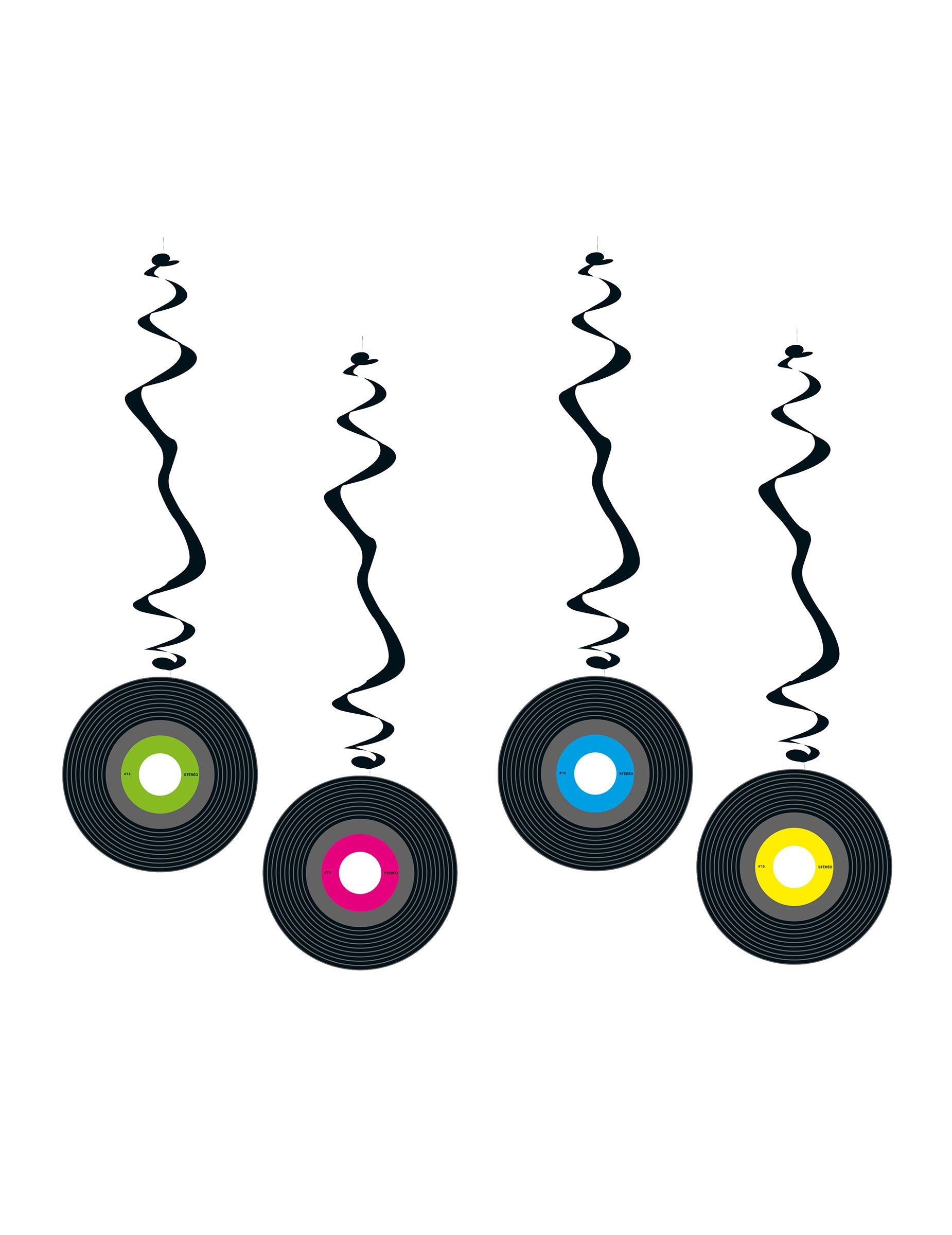 Ova serija uključuje 4 spiralne suspenzije. Sastoji se od plastične metalne crne spirale na kojem se suspendira vinilni disk u vatrootpornom papiru promjera 17 cm. Disk za ispis recto / leđa ima središte plave, zelene, ružičaste i žute boje. Pruža se plastični pričvršćivanje kako bi ga lako obustavio. Ove će suspenzije savršeno dovršiti dekoracija sobe na temi nostalgije iz 70 -ih!