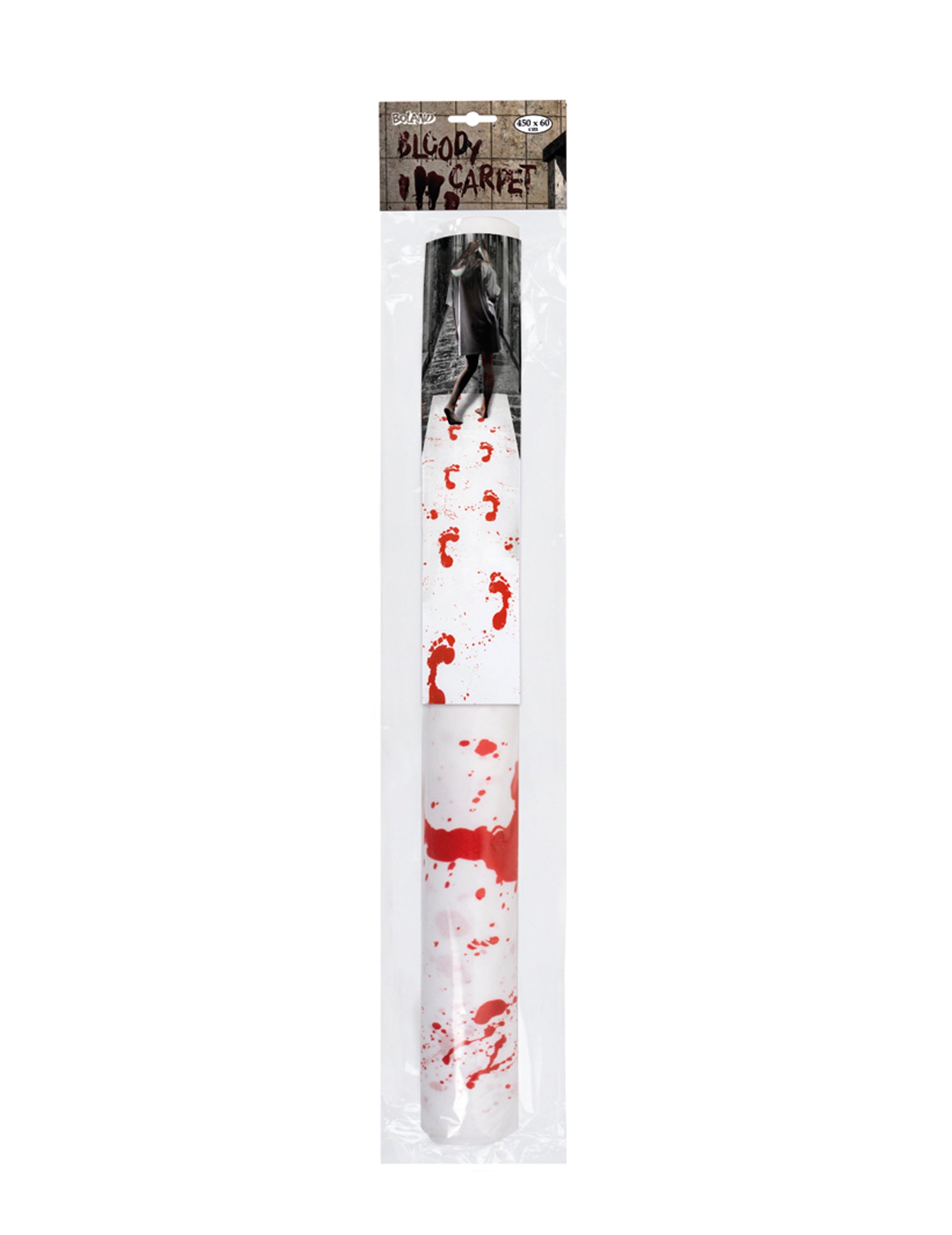 Ovaj ukras je tepih od tkanine od 450 x 60 cm. Bijela je i ima lažne tragove krvi. Imaju oblik stopala ili su jednostavni prskanje. Bit će savršeno dovršiti svoj dekor i stvoriti zastrašujuću atmosferu na Halloween večeri!