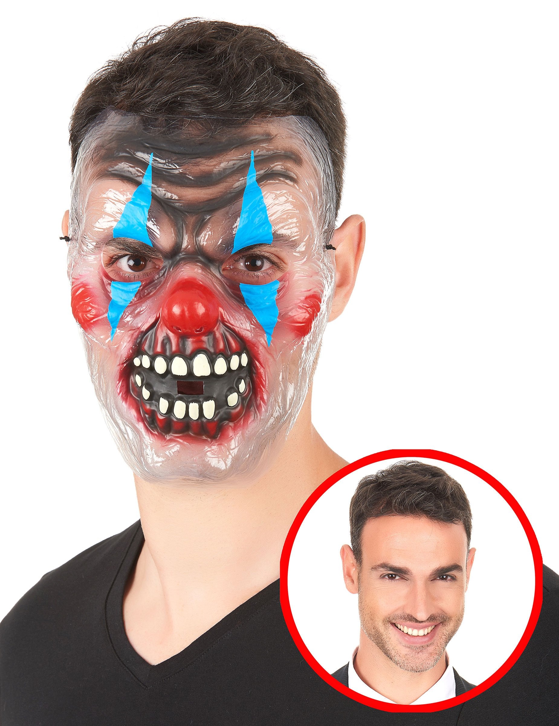Prozirna maska za odrasle obojene poput zlog klauna s iscrpljenim osmijehom. Prilog je fina elastika za prolazak iza glave. Da biste, na primjer, pristupili kostimu klauna za Noć vještica, ova će maska biti idealna za prikrivenu večer!