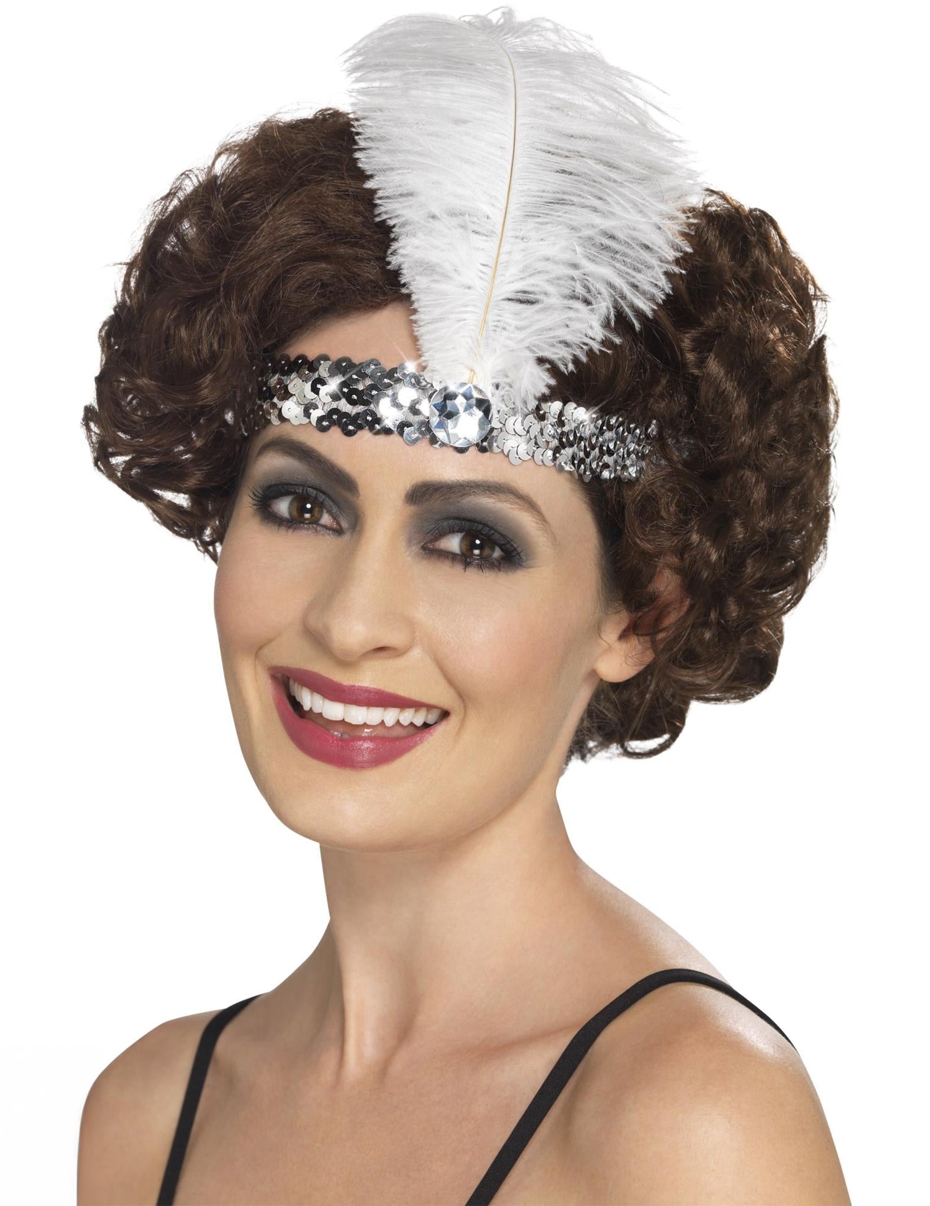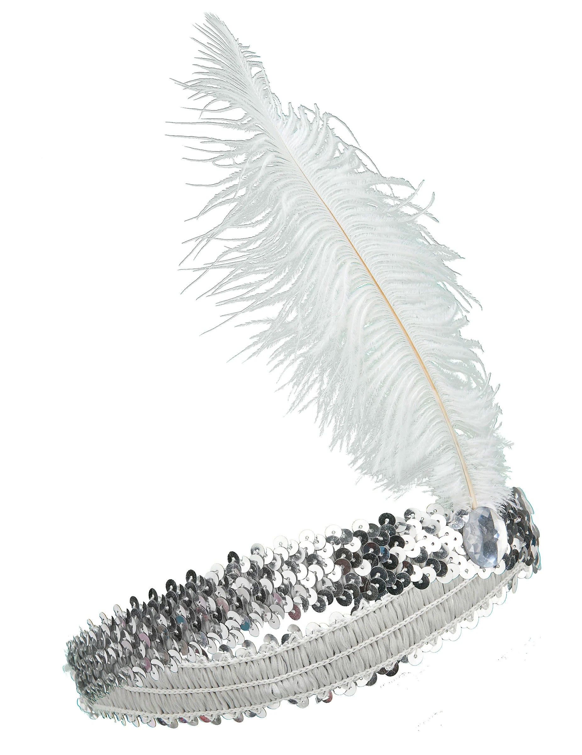 Ovaj srebrni Charleston traka za glavu sjajna je s perjem i sivim draguljem. Prekriven je šljokicama. Njegova elastična tkanina prilagodit će sve glave. Ovaj dodatak bit će savršen dragulj za dovršavanje vaše odjeće tijekom večeri na temu 20/30S!