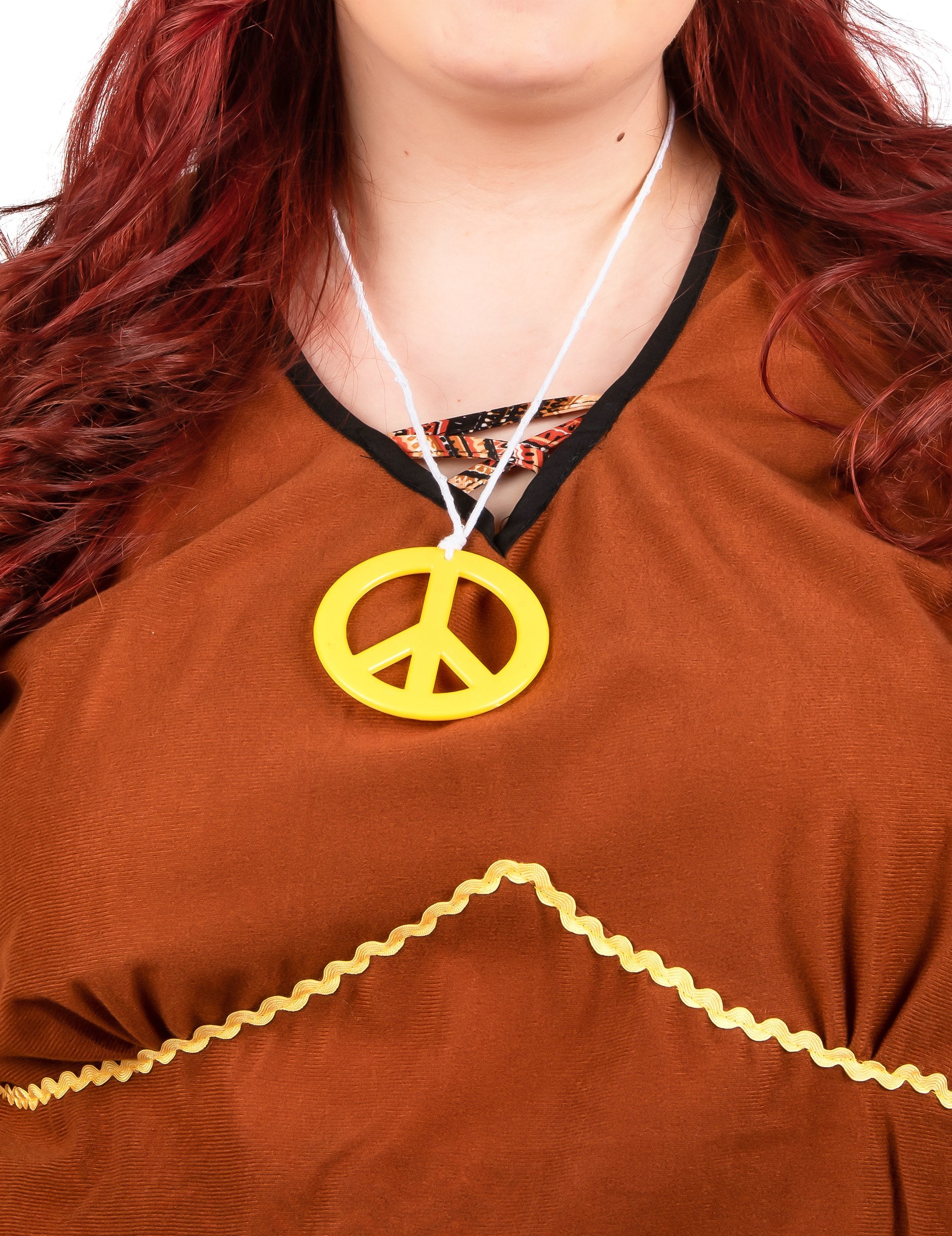 Hipi ogrlica sastoji se od bijele vrpce s žutim plastičnim privjeskom. Privjesak prikazuje simbol peace and love.