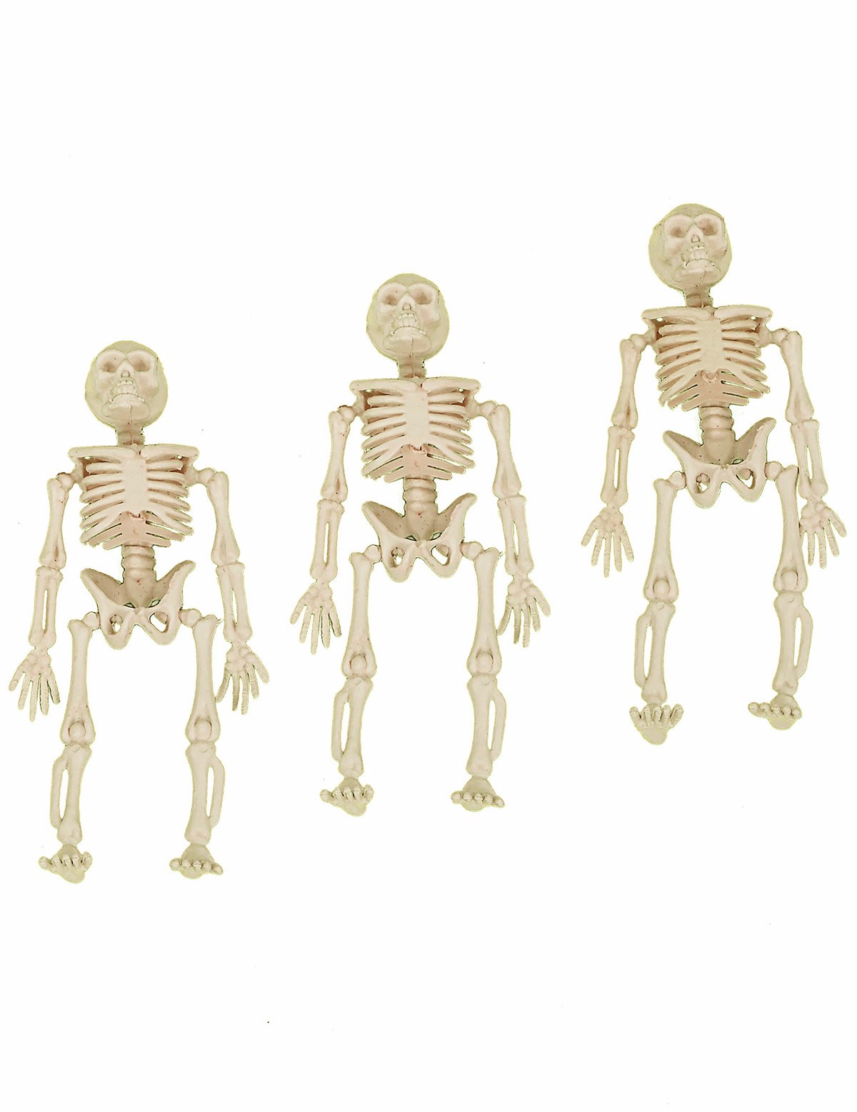 Ova serija sastoji se od 3 mala ukrasa za objesiti. U plastici predstavljaju male kosture duljine 12 cm. Nemaju sustav za pričvršćivanje, tako da ih možete objesiti sa sustavom po vašem izboru: kabel, ribolovna žica ... Ovi mali kosturi bit će savršeni za dovršavanje ukrasa sobe na večeri Noći vještica.