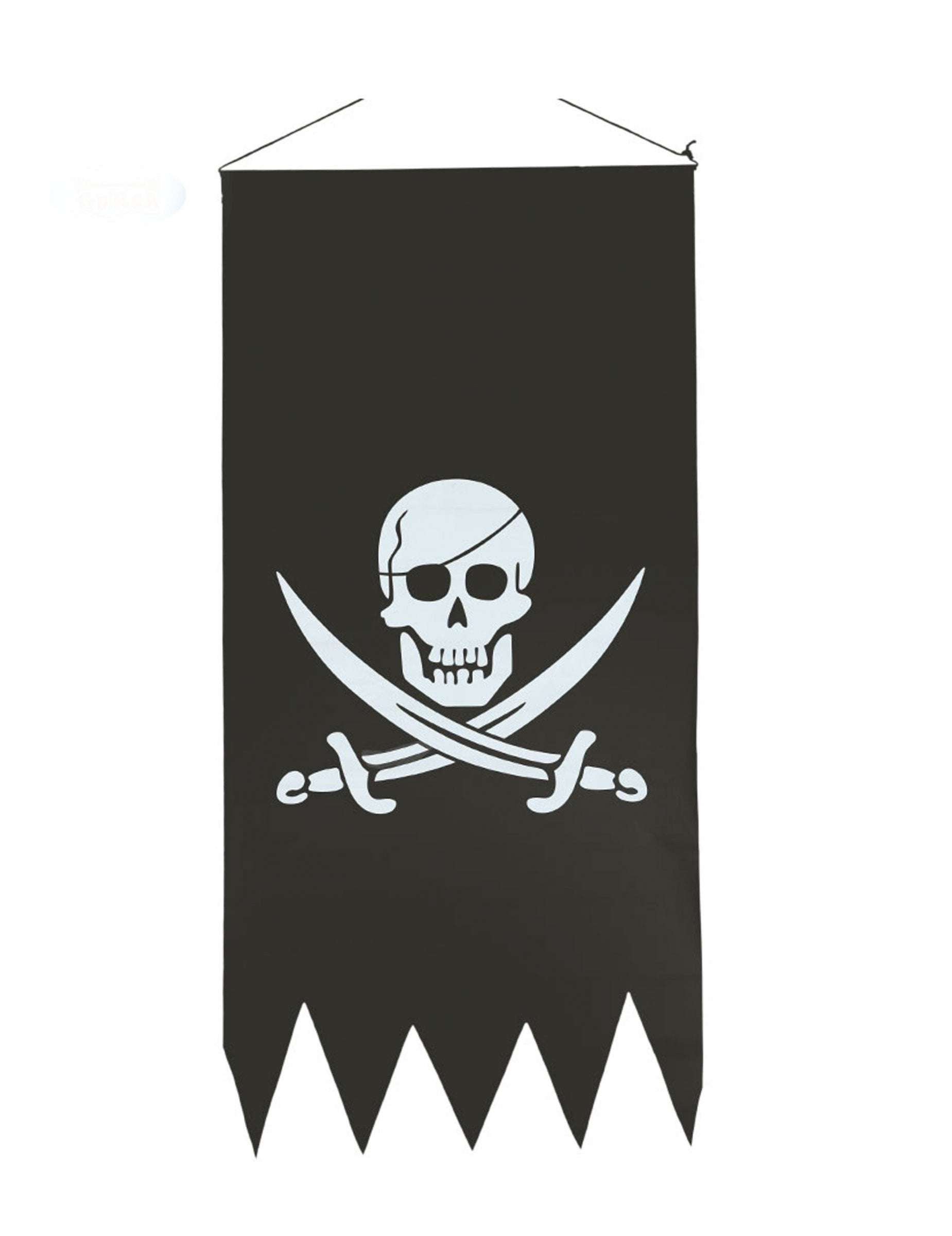 Ova gusarska zastava nalazi se u sjajnoj crnoj finoj tkanini s frikivom bijelom lubanji. Čvrsta stabljika smještena na vrhu zastave omogućit će vam da je dobro zategnu. Uključen je crni niz. Zastava je duga 86 cm širine 43 cm. Ovaj će ukras biti idealan za vaša ulazna vrata ili zid za vrijeme zabave na temu gusara, na primjer!