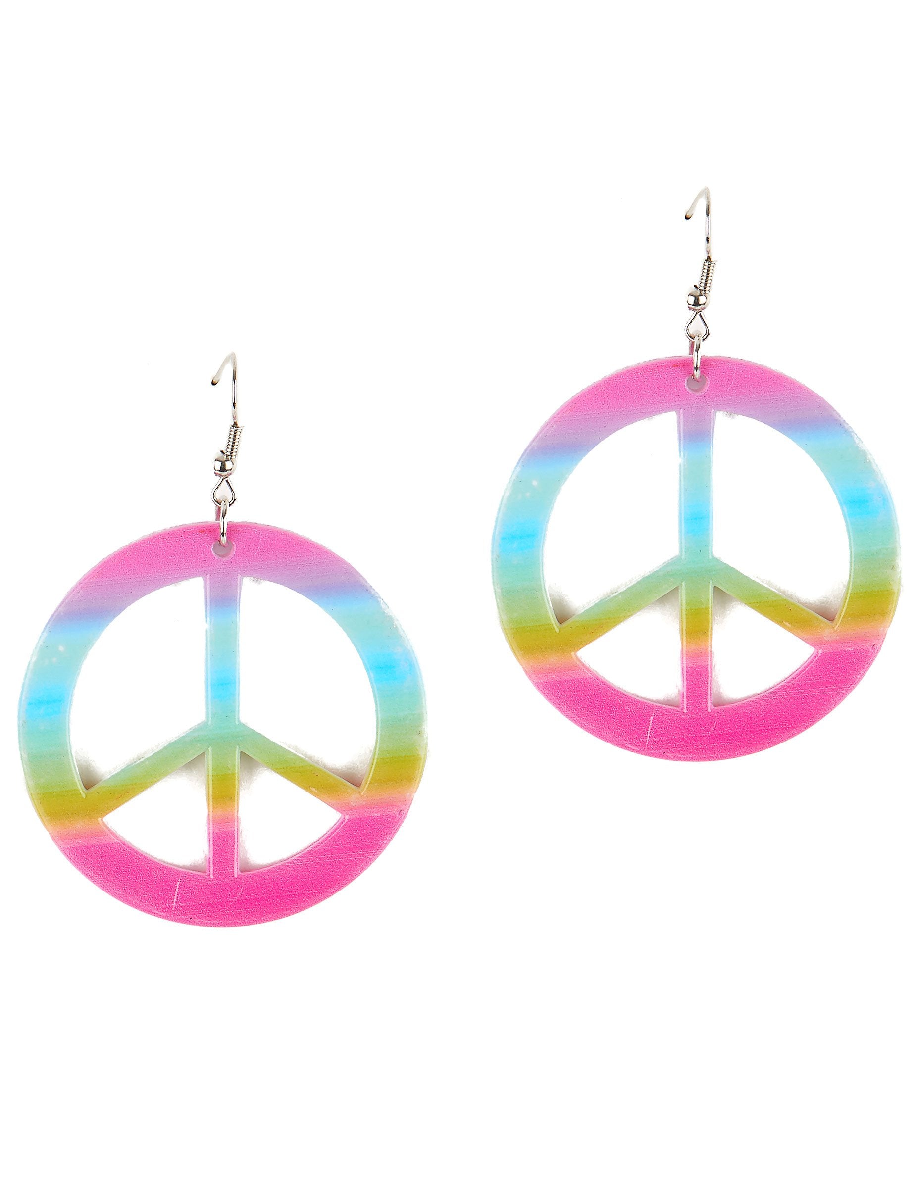 Ove naušnice za odrasle su plastične. Oni predstavljaju više nego poznati simbol "mira i ljubavi". Boja se sastoji od rastopljenog višebojnog učinka, a metalne kovrče su fiksirane na vrhu. Stoga će biti potrebno probiti uši. To je dovoljno da suosjećajno pristupite svom hipi kostimu za tematsku zabavu.