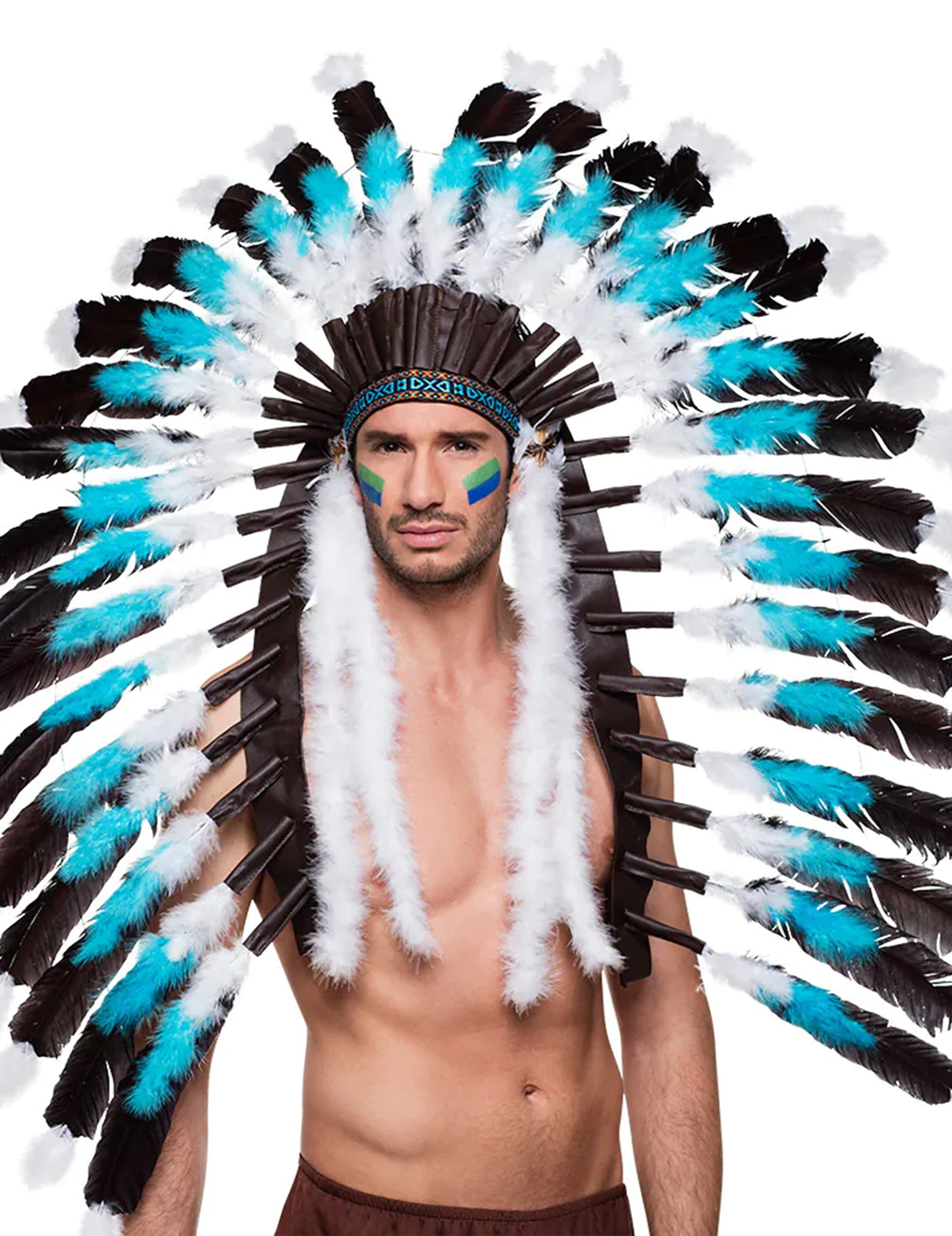 Ova indijska glava namijenjena je odraslima i mjeri duljinu oko 53 cm. Sastoji se od četrdeset lažnih perja crne, tirkizne i bijele, visine 42 cm. Prisutni su na prednjem dijelu ove kape, navijači u bijelim okrivljenim plumettima duljine od oko 48 cm. Ova pokrivač mora biti postavljena na glavu pomoću crne elastike. Crni transparent ukrašen aztečkim uzorcima u plavoj i narančastoj boji također ukrašava ovu kapu. Igraju ulogu indijskog poglavara tijekom prerušene večeri, daleki zapad.