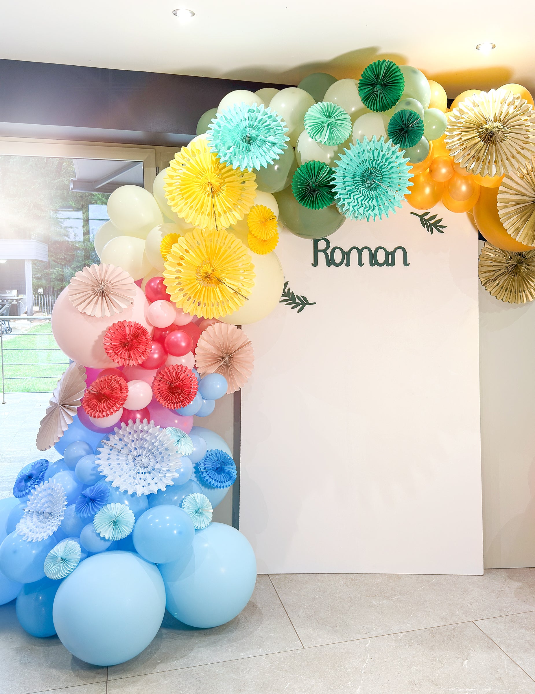 Za zračni dodir! Ovo se sastoji od 5 malih rozeta. U papiru saća vrlo su lagani i svaki ima drugačiju boju: narančasta, plava, zelena, žuta i ružičasta! Svaka od njih mjeri promjera oko 15 cm i lako se pričvršćuju na strop pomoću malog diskretnog bijelog niza. Ove prilično male rozete su ključne za ukras aviokompanije