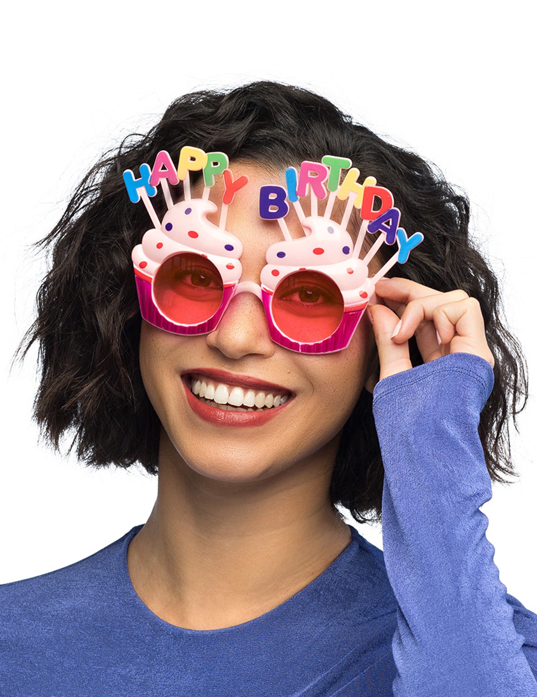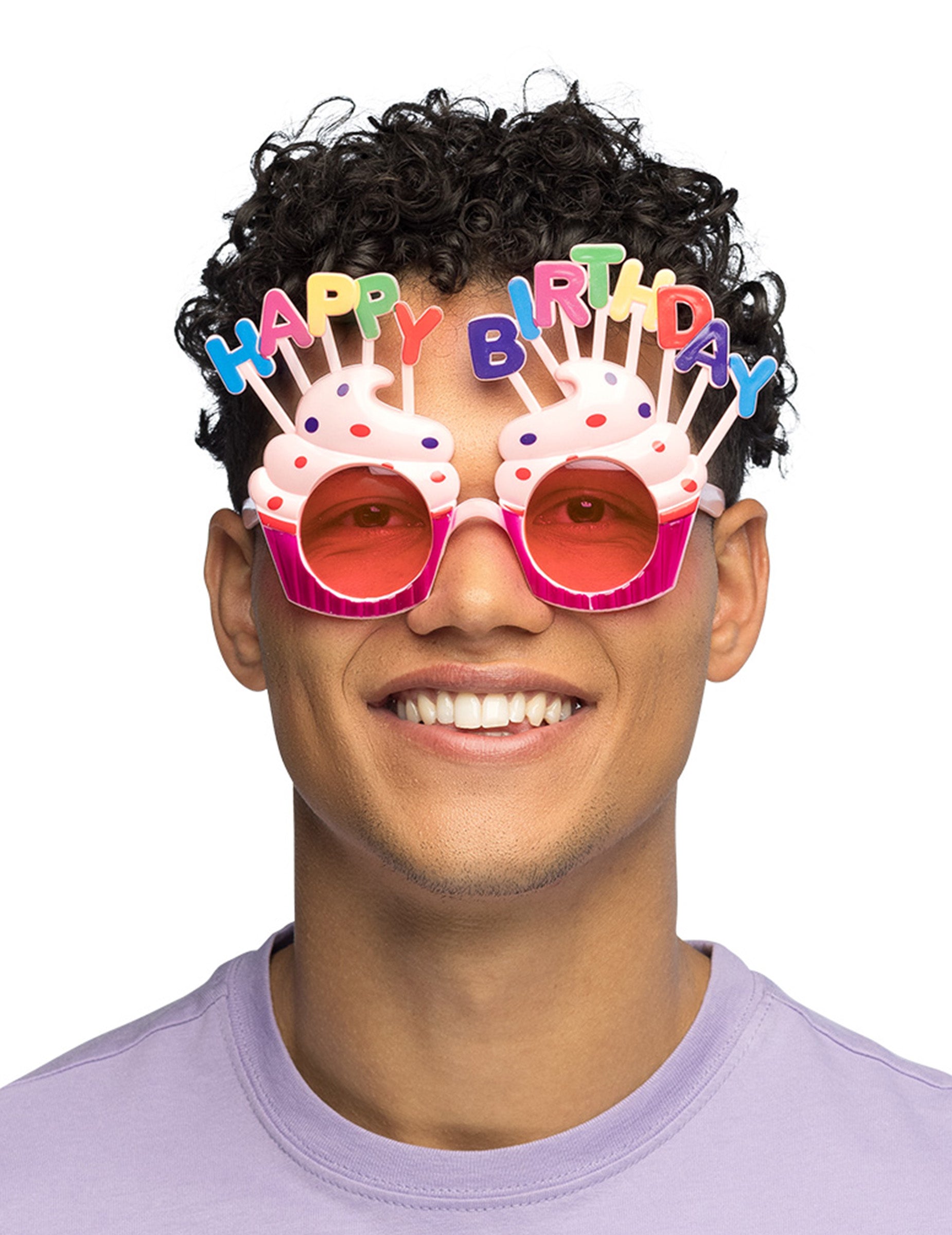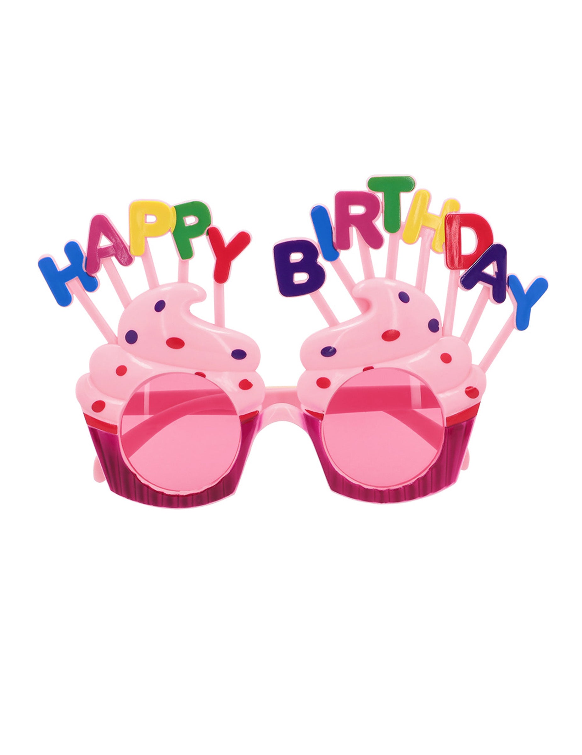 Ove sretne rođendanske naočale za odrasle su u krutoj plastici. Oni su u obliku kolača čija je baza prekrivena ružičastim šljokicama. Grane i vrhnja kolača su svijetlo ružičasta. Cupcakes nadvladava lažne šarene plastične svijeće koje tvore poruku "Sretan rođendan". Oni su širine otprilike 15 cm. Ove će naočale biti savršene za proslavu rođendana s prijateljima!