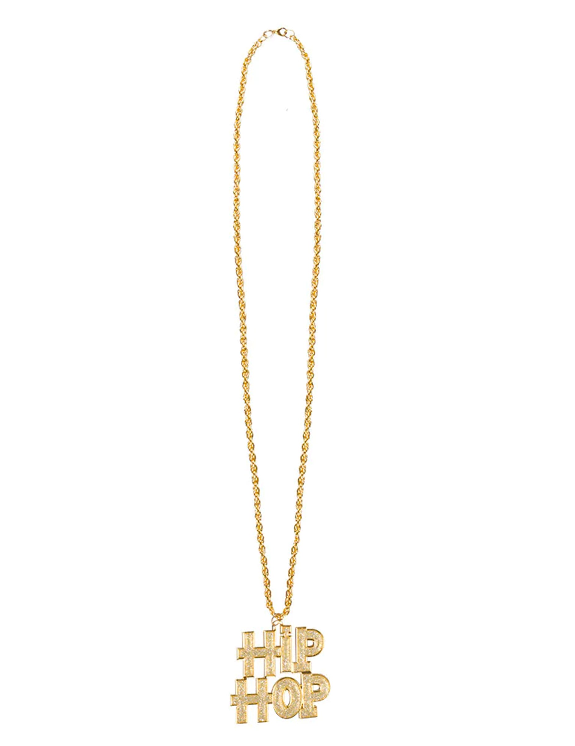 Ova zlatna ogrlica sastoji se od lanca i privjeska. Lanac sastavljen od uvijenih mreža dugačak 41 cm. Privjesak mjeri 7 cm za 7 cm i nosi natpis "Hip Hop". Povodom Bling Blingove večeri, ovaj će dragulj savršeno obući vašu odjeću hip hop zvijezde!