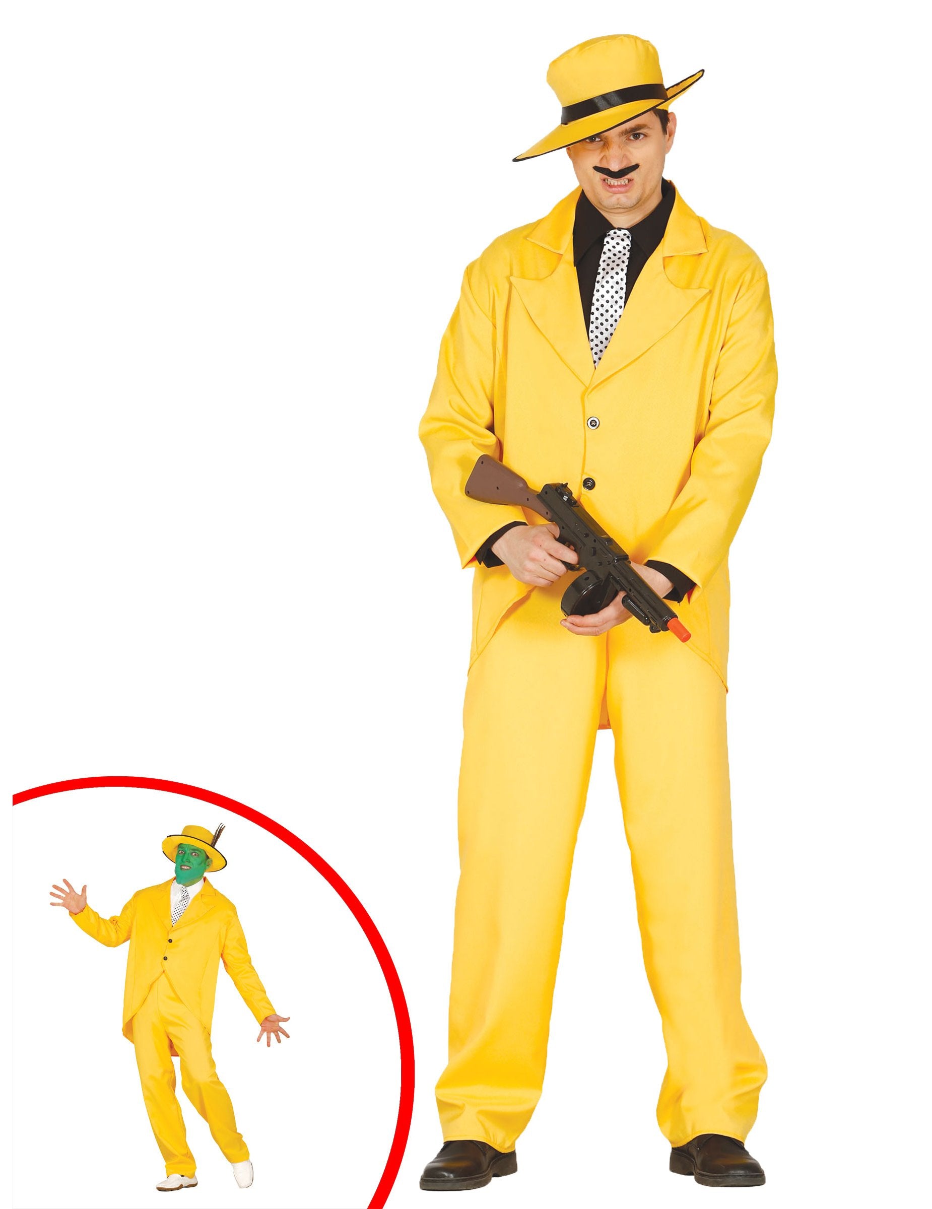 Ovaj žuti gangsterski kostim namijenjen je odraslima i uključuje jaknu, hlače, kravatu i šešir (košulja, brkovi, oružje i cipele nisu uključeni). Jakna i hlače su u gustoj žutoj tkanini. Hlače su na elastičnoj veličini, a jakna se zatvara zahvaljujući dva crna gumba. Lažna kravata izrađena je od bijele polusitne satenske tkanine s crnim polka točkicama. Elastika će vam omogućiti da prođete dodatak oko vrata. Šešir je izrađen od fleksibilnih i širokih rubova. Satenska crna vrpca ukrašava toranj glave koji mjeri otprilike 58 cm. Tijekom tematske večeri, na primjer, ova šarena prerušavanje bit će idealna za postavljanje sjajnih!