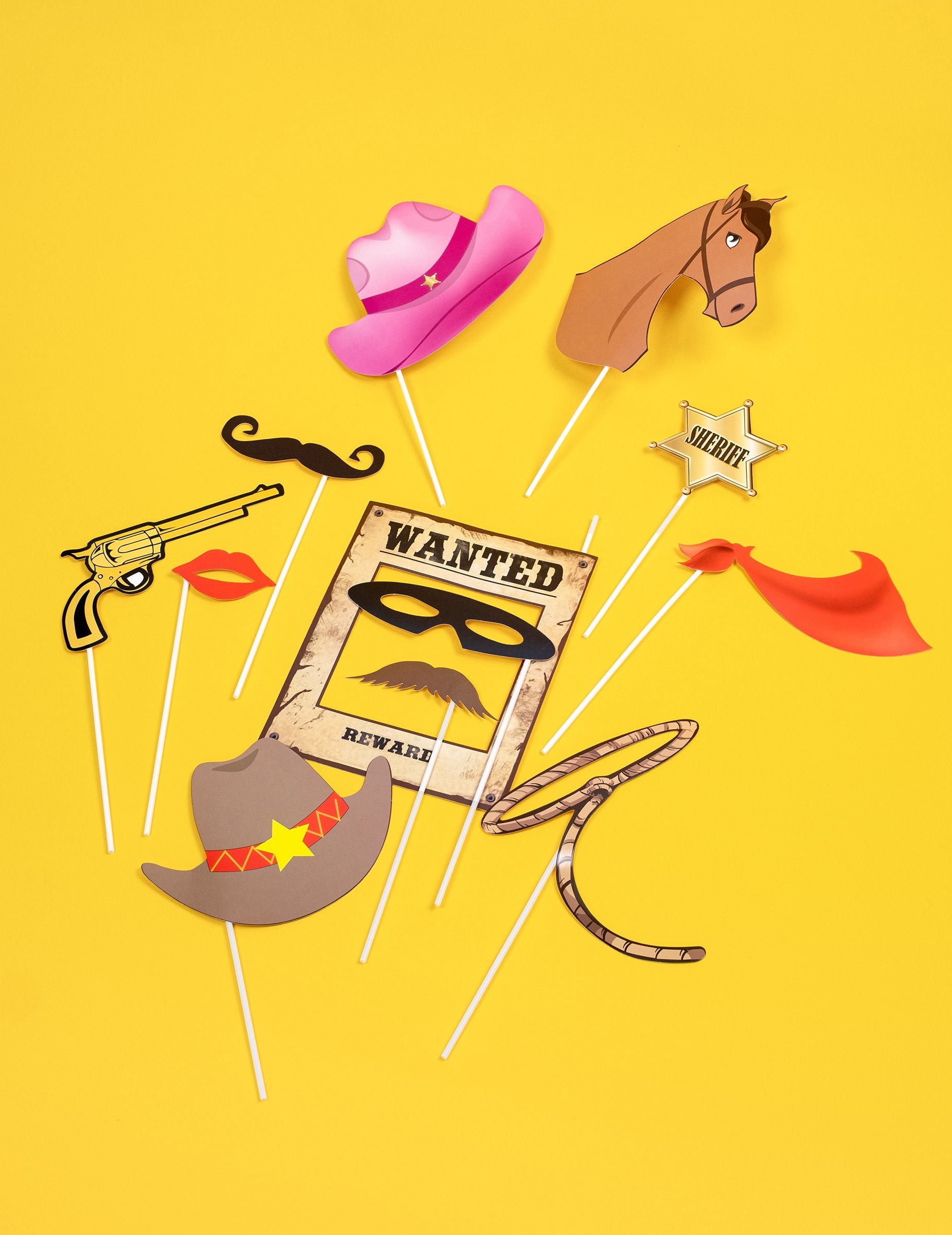 Ovaj se komplet za fotobove sastoji od 12 kartonskih elemenata, pričvršćenih na plastičnim vrhovima visokim 23 cm. Elementi, na temu zapadnjaka, predstavljaju: - 2 brkova, smeđa i crni - 1 crni Bandit vuk - 1 lasso - 1 ujedinjena crvena bandana - 1 smeđi konj - 1 kaubojski šešir - 1 kaubojski šešir jasan - 1 šerif Zvijezda - 1 Zlatno žuti pištolj - 1 crvena usta - 1 "traženo" plakat Ovaj komplet za Photobooth bit će savršen za stvaranje originalne animacije povodom večeri na temu kauboja.