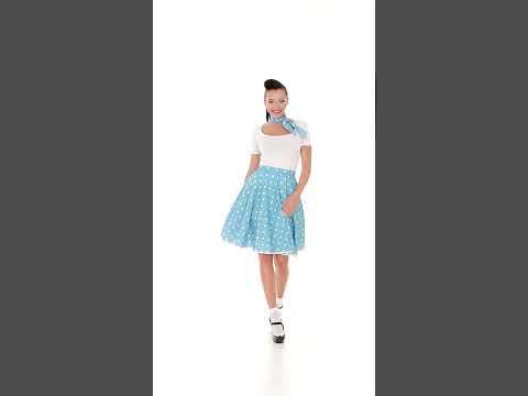 Ovaj kostim iz 1950-ih za žene sastoji se od suknje i šal (majica, čarape i cipele nisu uključeni). Cijela je tirkizna s bijelim graškama. Suknja klizača ponuđena u jednoj veličini zatvara se straga pomoću gumba. Tri dostupna gumba omogućit će vam da prilagodite suknju svojoj morfologiji. Mjeri visok oko 60 cm i pada iznad koljena. Šal se podudara i jednostavno se okuplja oko vrata. Ovaj će set biti idealan za ronjenje 1950 -ih povodom prerušene večeri ili za karneval! Autorska prava Widmann SRL