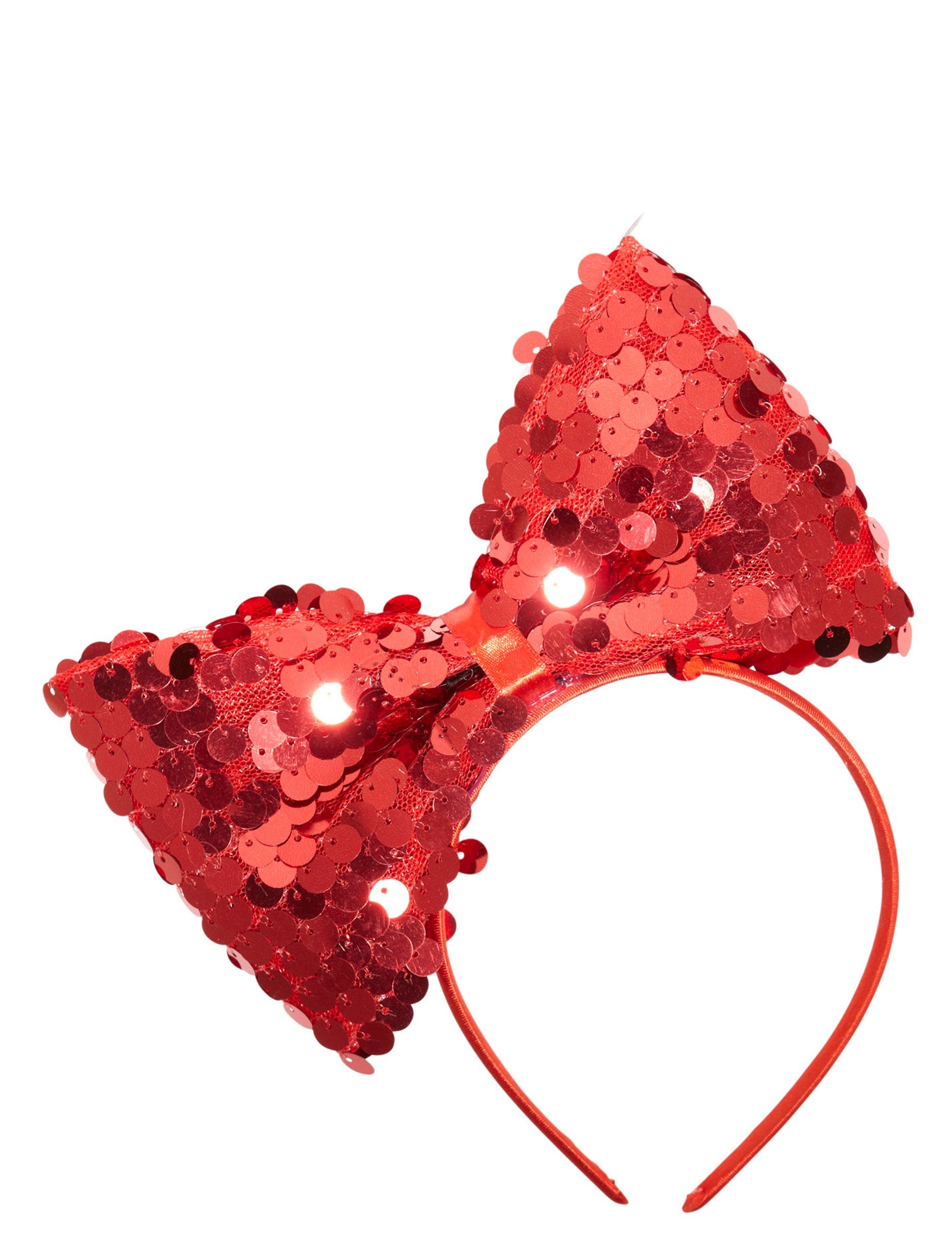 Ovaj odrasli trak za glavu nadvladava veliki crveni čvor sa šljokicama. Traka za glavu je plastična prekrivena crvenom tkaninom. Čvor je izrađen od tkanine prekrivene crvenim šljokicama. Širina je oko 19 cm i oko 12 cm na najvišoj. Ova traka za glavu bit će idealna za večer "Rhinestone + Glitter" ili za novu godinu! Autorska prava Widmann SRL