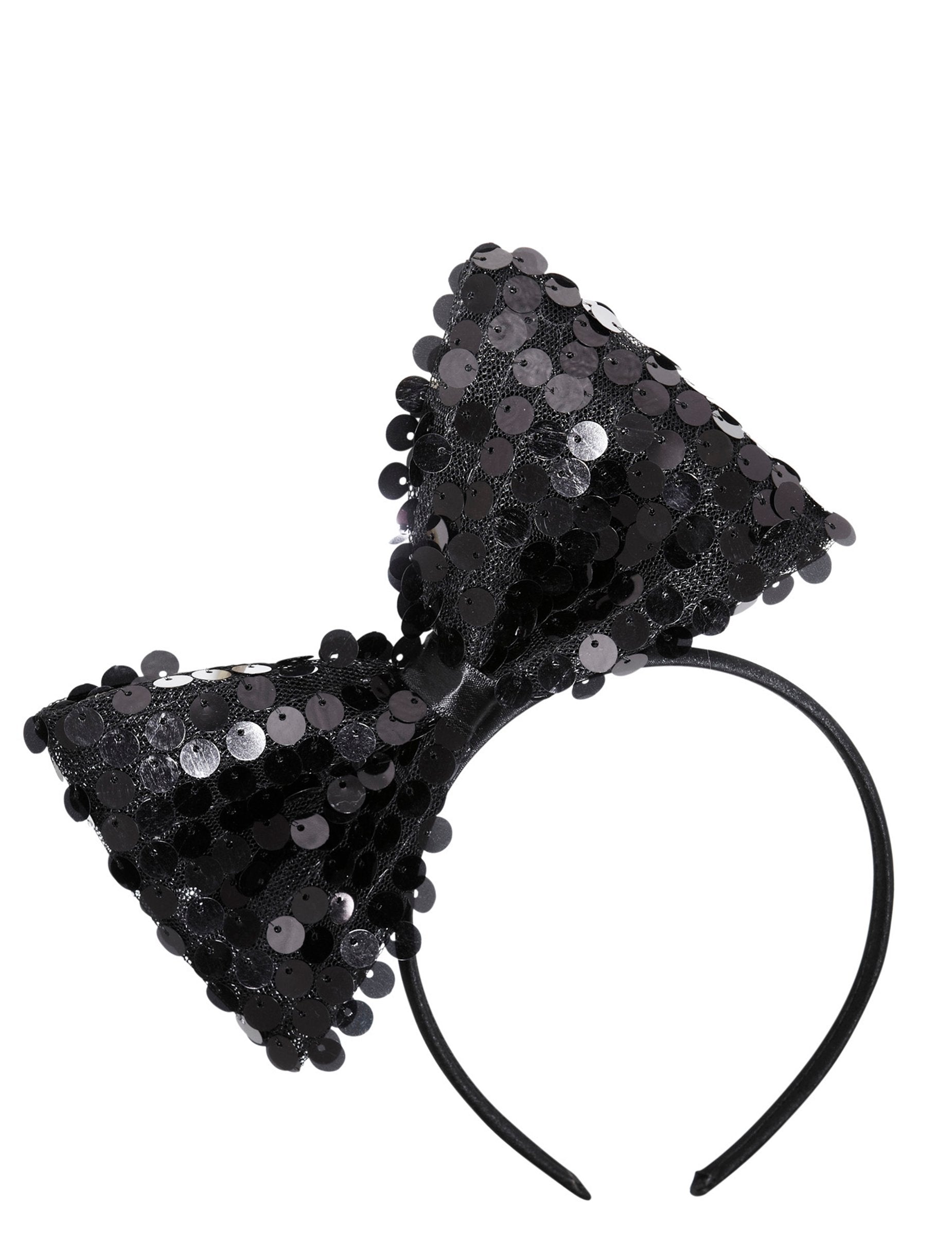Ovaj traka za glavu za odrasle je prekriven velikim crna leptir-mašna sa šljokičastim uzorkom.