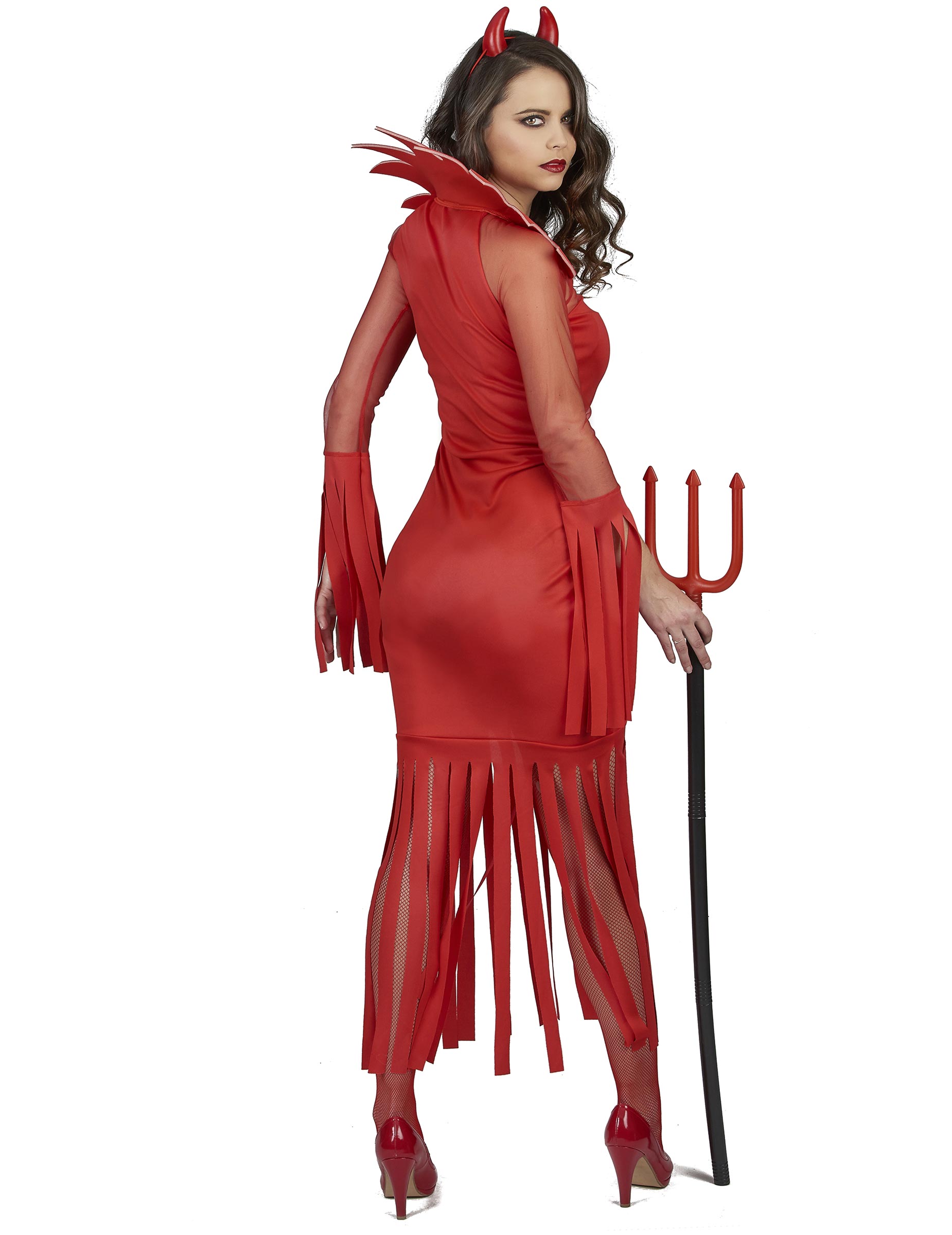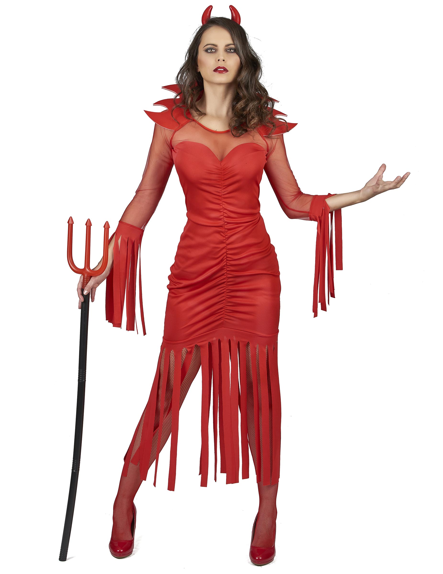 Ovaj vatreni prerušavanje za žene uključuje haljinu i kapu (riblji mreža, cipele i žezlo nisu uključeni). Haljina je zakrivljena i okupljena cijelom dužinom šavom usred haljine. Izrez kao i rukavi izrađeni su od crvenog tila, a veliki ovratnik izrađen od fleksibilne pjene vrlo će lijepo ukrasiti luku za glavu. Kraj rukava, kao i dno haljine, ima rubove za evociranje vatre. Nakrivač se sastoji od fine i crvene elastike na kojoj su fiksirani fleksibilni plastični rogovi. Oni će vam savršeno obući kosu ili periku. Bit ćete najseksepilniji demone tijekom večeri Noći vještica. Pazite da nikoga ne spalite svojim stilom!