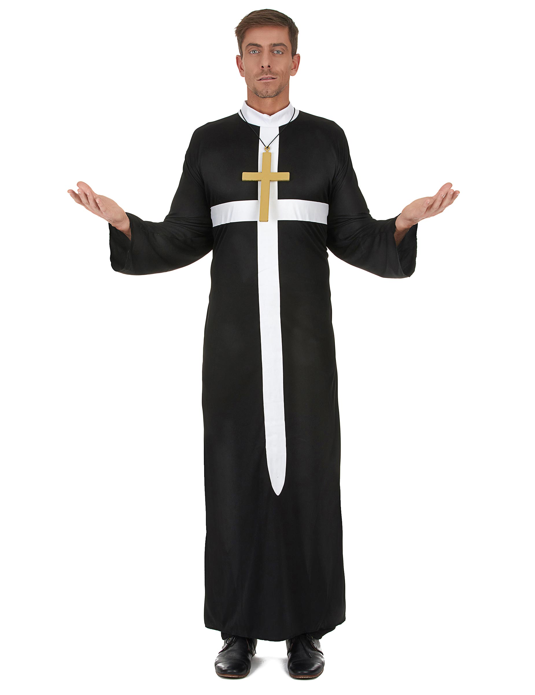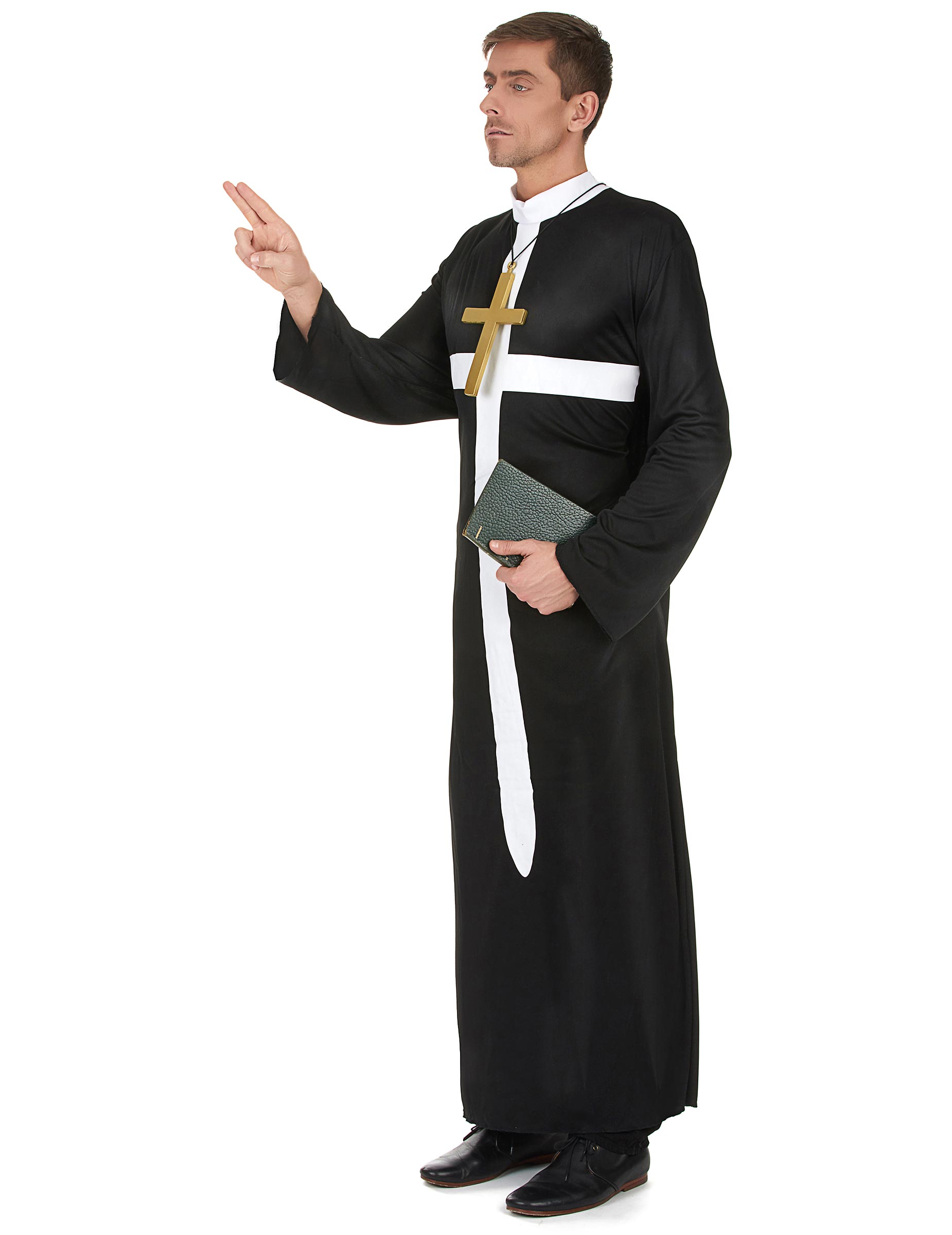 Prerušavanje ovog svećenika za muškarce ima dugu crnu haljinu sa širokim rukavima. Prolaz je bijeli i ispružen velikim bijelim križem. (Zlatni križ nije uključen). Cijelo će biti vrlo ugodno igrati religiozno tijekom prerušene zabave ili zabave!