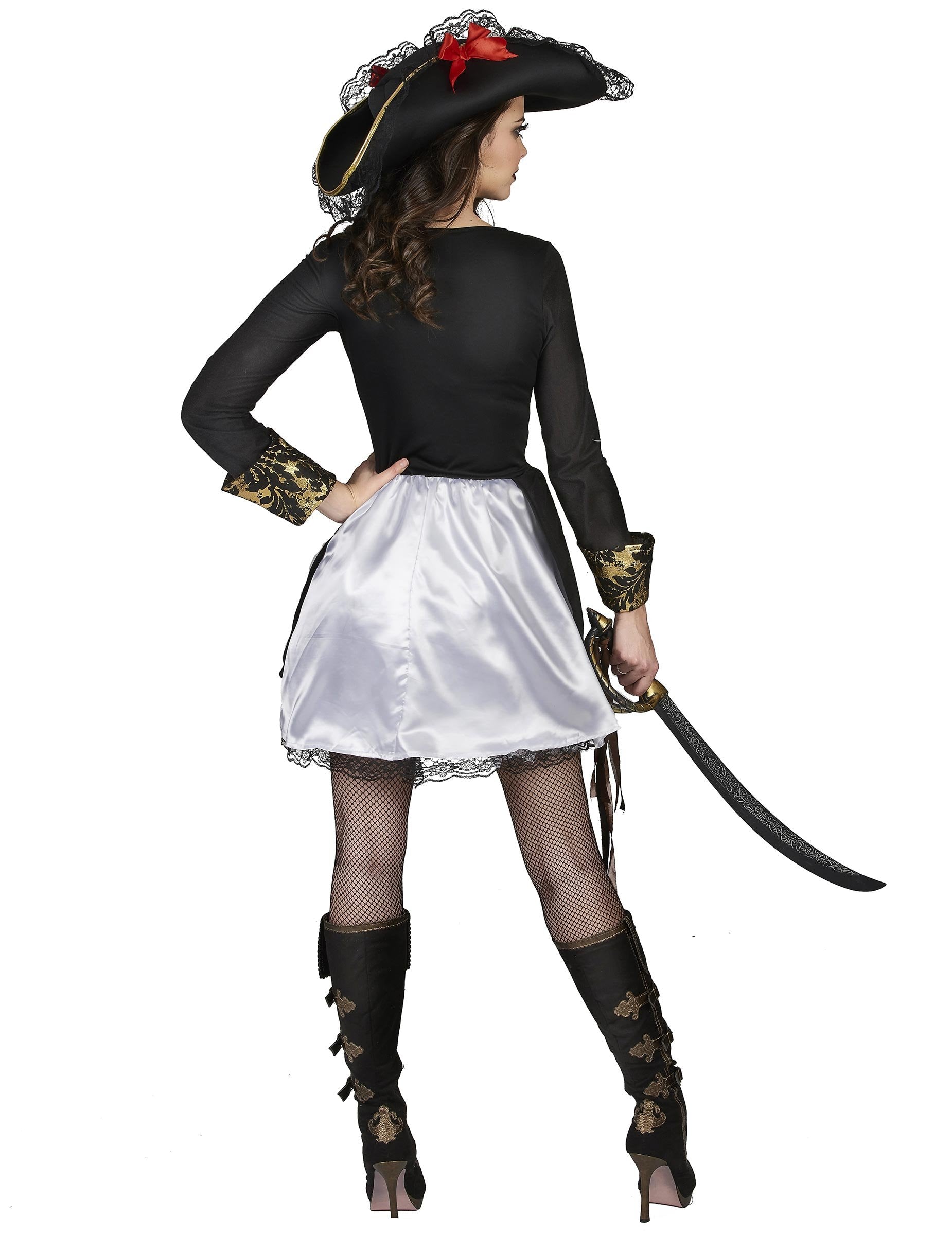Ovaj seksi gusarski kostim za žene sastoji se od haljine i šešira (tajice, čizme i sablja nisu uključeni). Kratka haljina zakrivljena je u struku i natečena od suknje. Dugi rukavi položili su barokno zlatne uzorke koji se nalaze na pettikontima. Crni dijelovi izrađeni su od fleksibilnog filca, dok su bijeli elementi saten. Ispod suknje, bijela obloga od filca obrubljena crnom čipkom daje puno šika u cjelinu. Savjet: Za još više volumena za suknju, preporučujemo dodavanje dodatnog štikla (prodaje se zasebno). Crni šešir obrubljen čipkom i ukrašen malim satenskim crvenim čvorovima, odgovarat će kulama glave blizu 60 cm. Njegov pjenasti materijal pružit će mu optimalnu podršku. Prilika za prerušenu zabavu, sigurno ćete biti najuvjerljivija s ovom seksi gusarskom prerušenom!