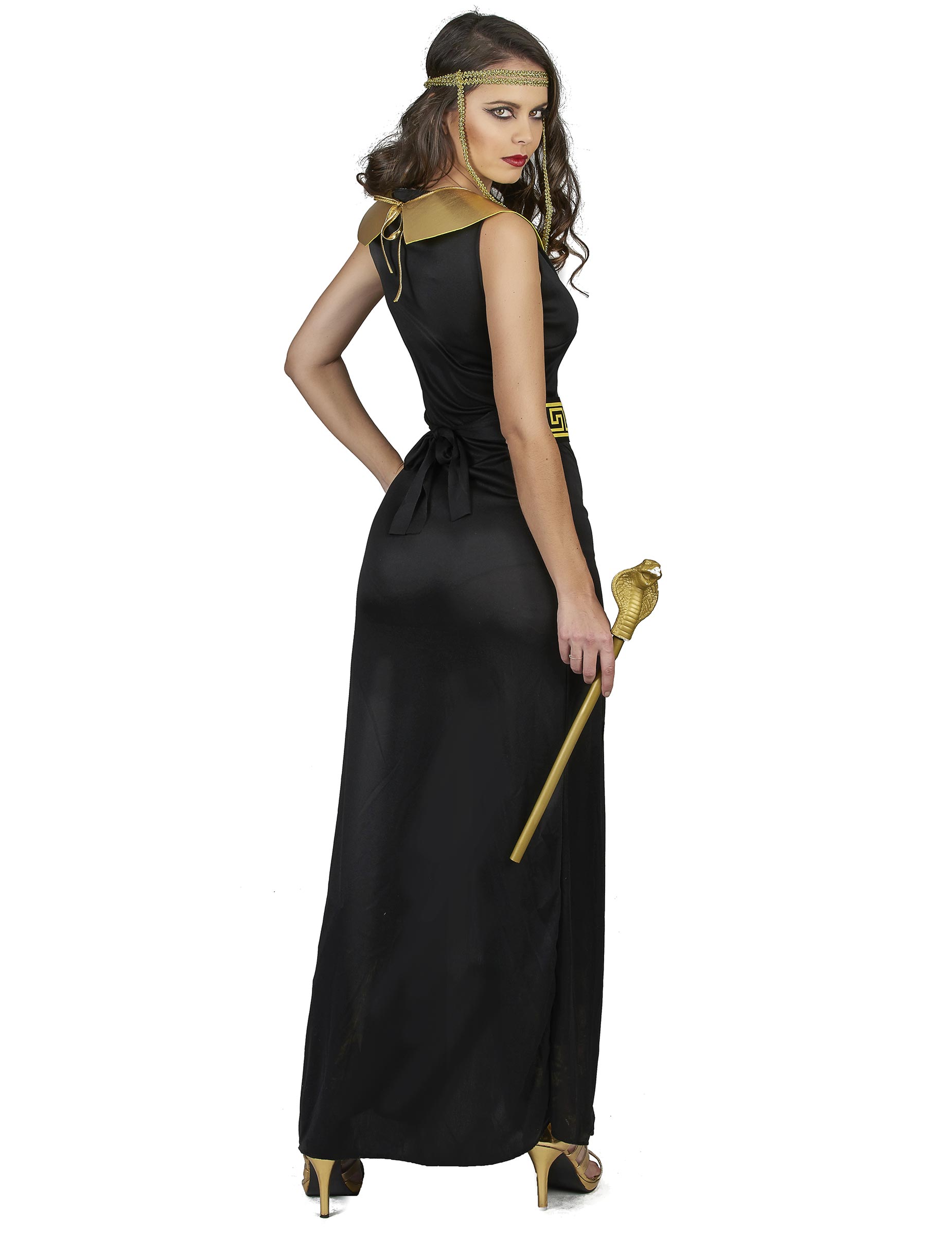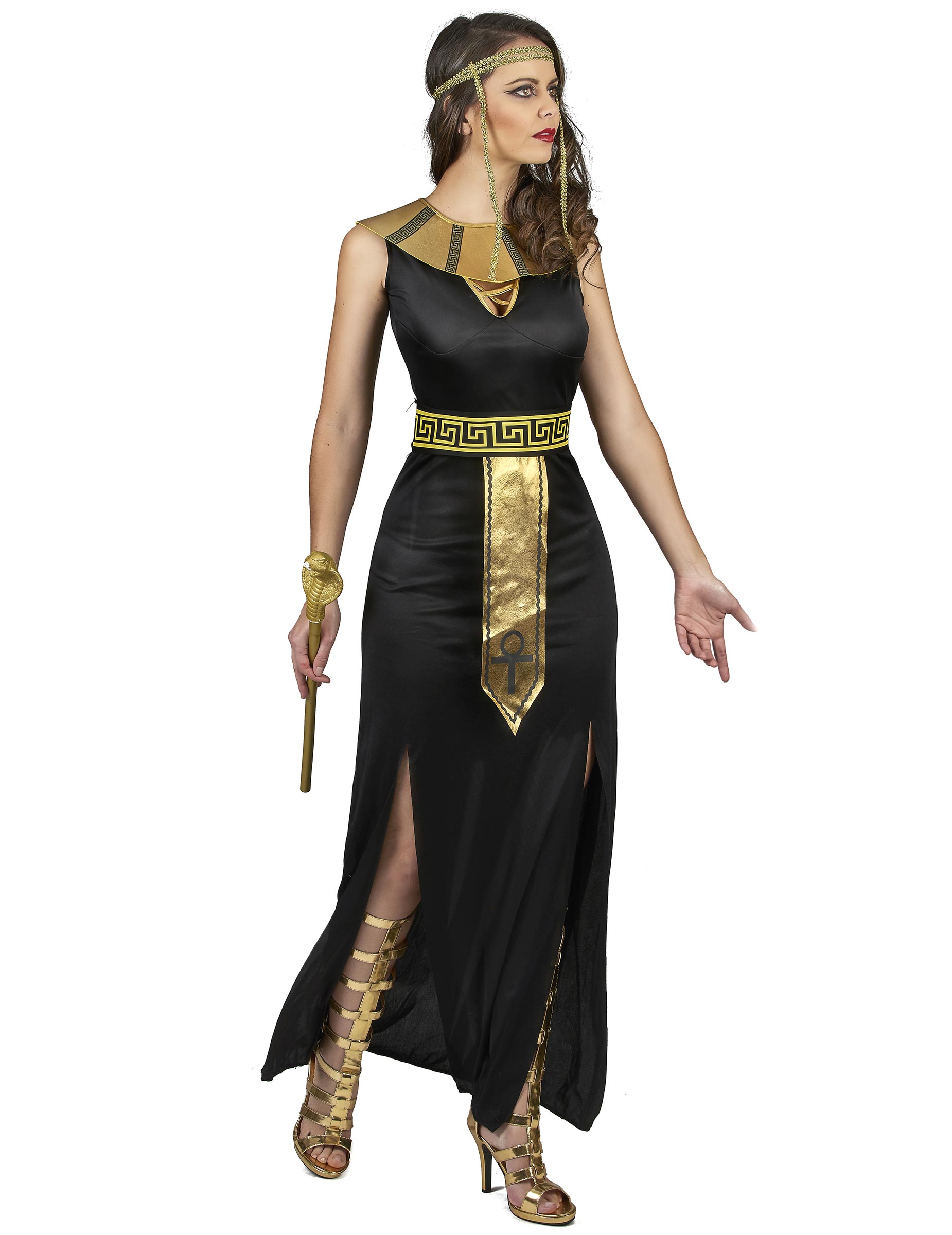Ovaj egipatski kostim za žene uključuje haljinu, ovratnik, kapu i pojas. Duga i crna haljina podijeljena je na dva mjesta od koljena. V V je ukrašen zlatnim granicama koje se presijecaju. Prolaz je pričvršćen pomoću veza i ispisan je s egipatskim motivima. Zlatna pletenica je elastična i stoga će odgovarati većini kula za glave. Konačno, pojas koji će biti vezan u leđima savršeno pristupa vašoj veličini. Tijekom stranke s temom drevnog Egipta ili bilo koje druge prilike da vas preruši, ovaj kostim Cleopatre bit će idealan.