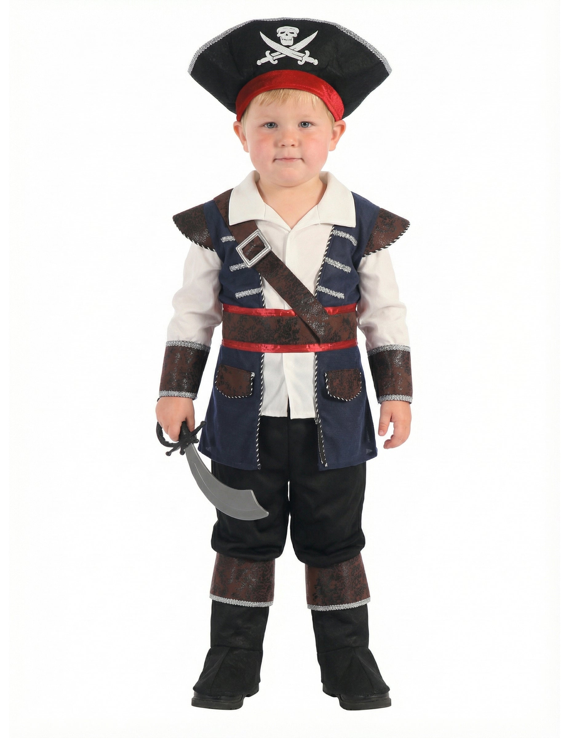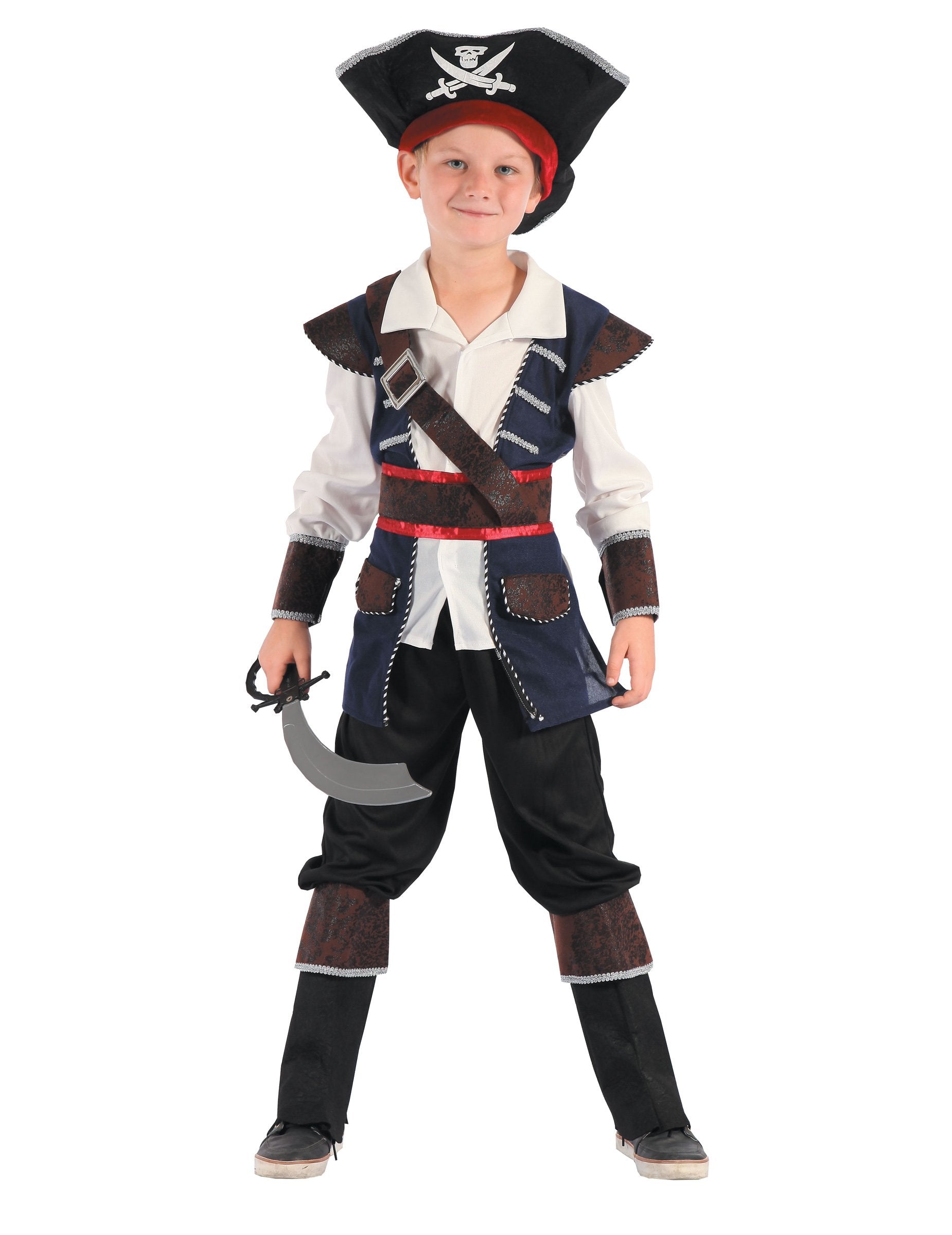 Ovaj gusar prerušen za dječaka sastoji se od vrha, hlača i šešira. Vrh predstavlja bijelu bluzu s tamnoplavom jaknom. Ramena i manšete su u imitaciji smeđe tkanine kože. Odgovarajući lažni pojas dolazi na ogrebotinu na struku. Ovaj vrh je sivi ujedinjeni u leđima. Elastična je u struku i zatvara se sprijeda ogrebotinama. Hlače su crne s filcama s koljenima. U struku je elastična za veću utjehu. Gusarski šešir je crn s crvenom trakom u podnožju, kao i bijela lubanja s prednje strane. Ovaj gusarski kostim bit će savršen za ostavljanje lova na blago na Dan karnevala.