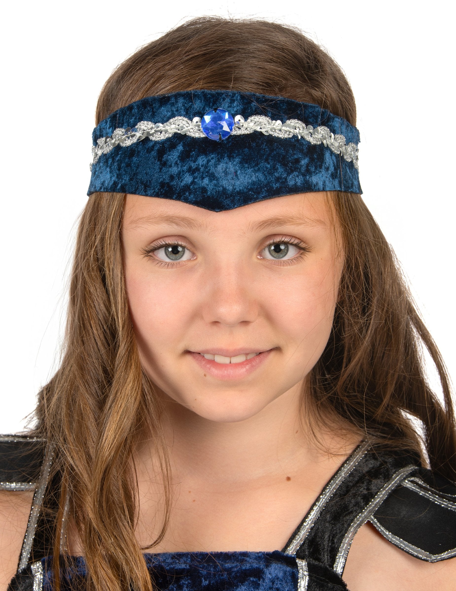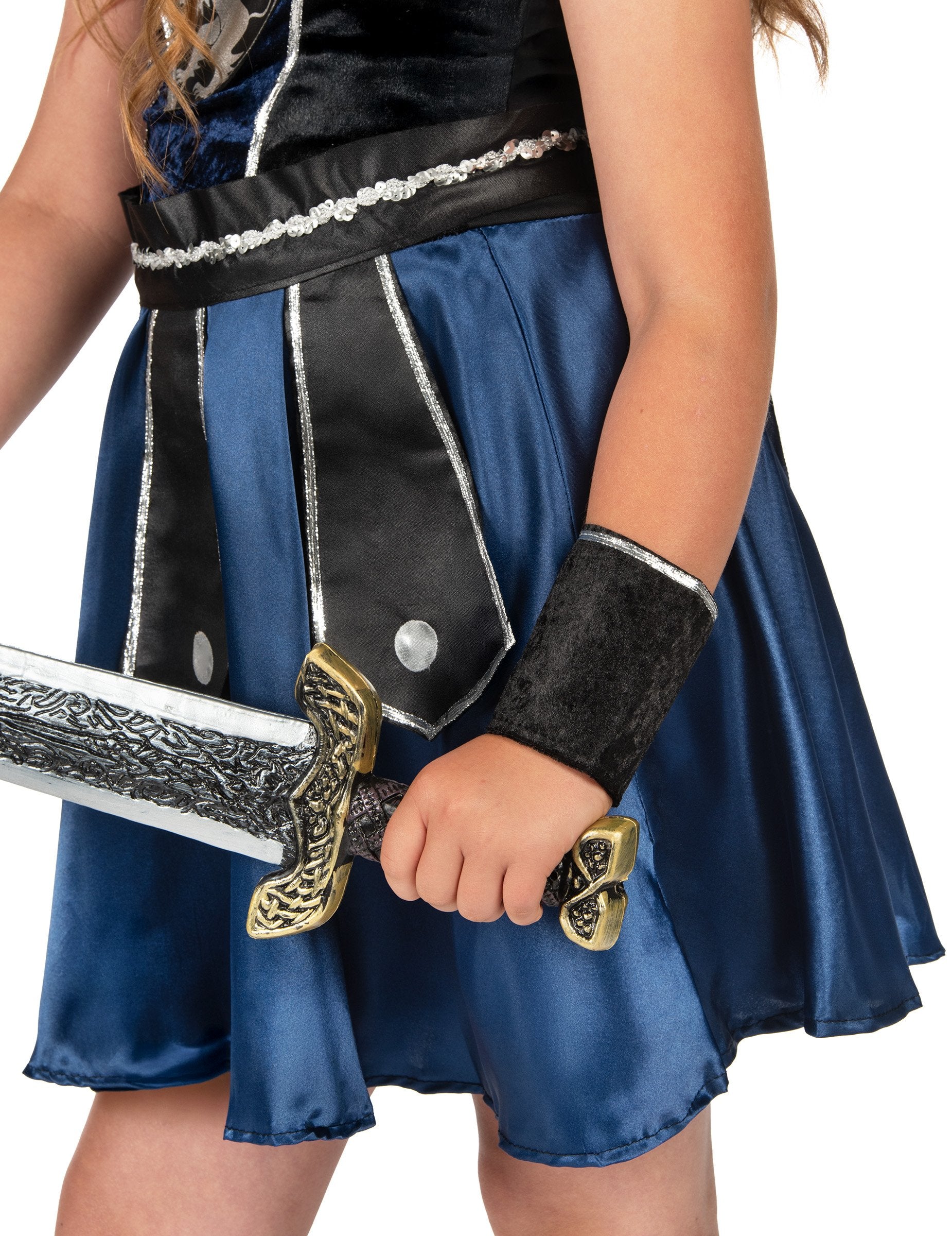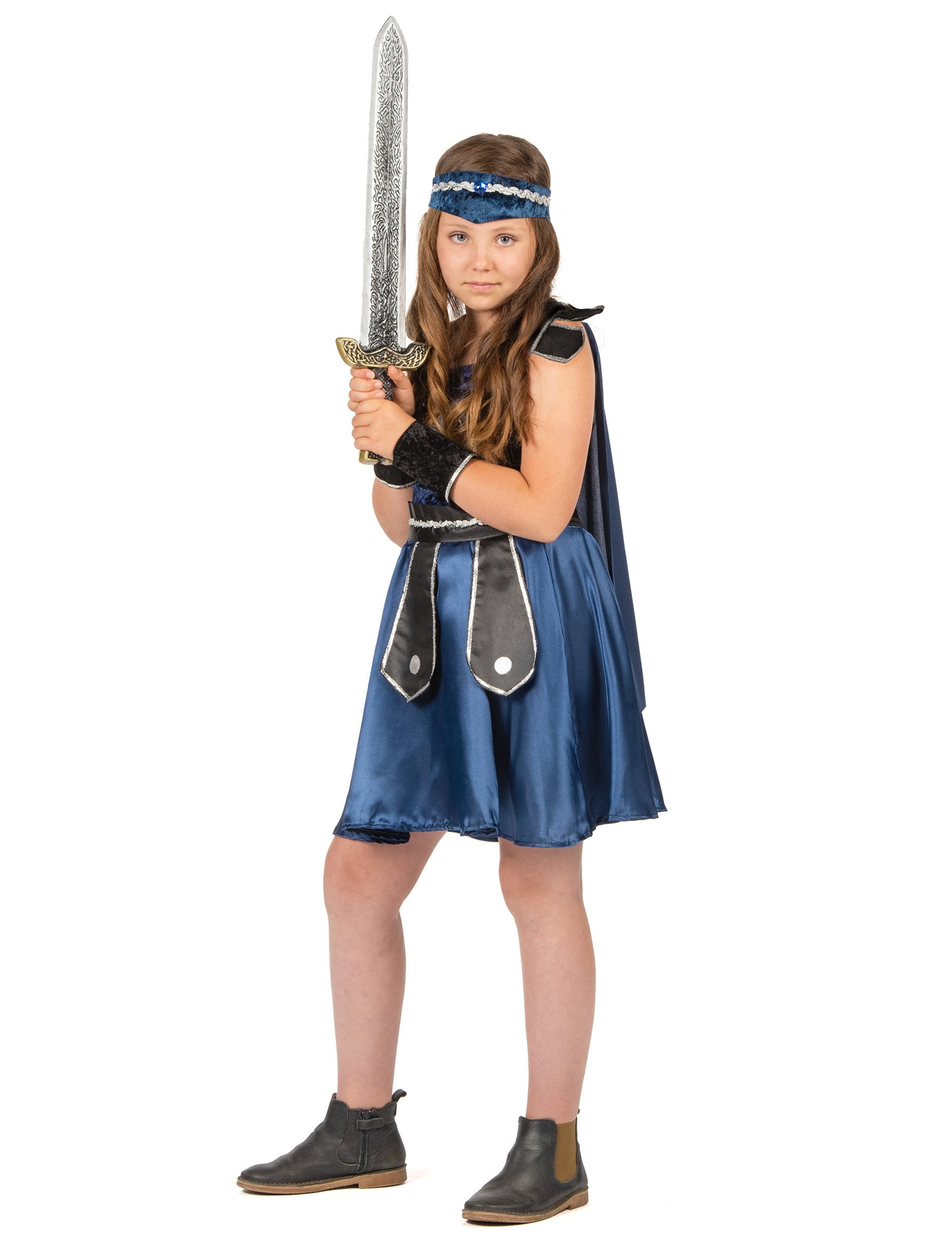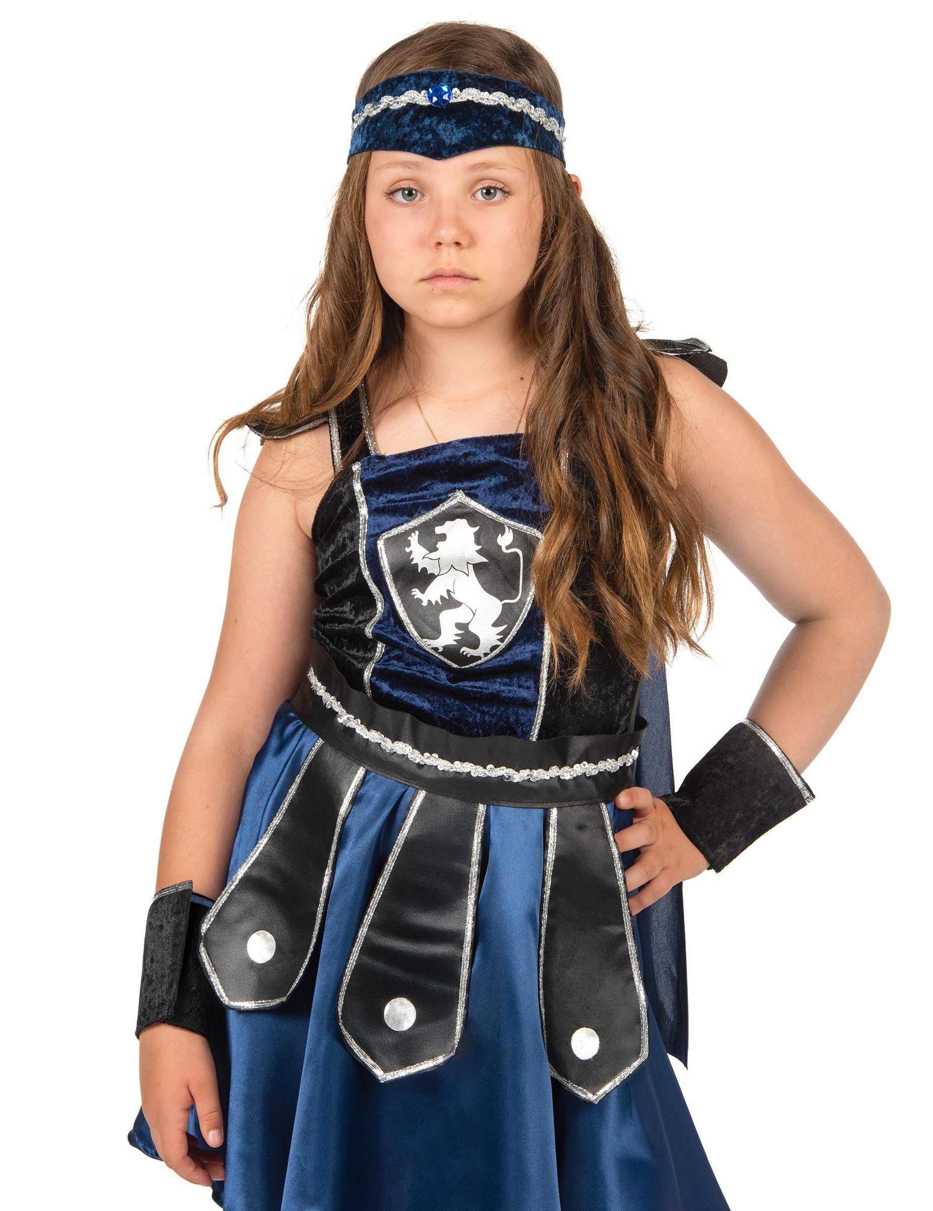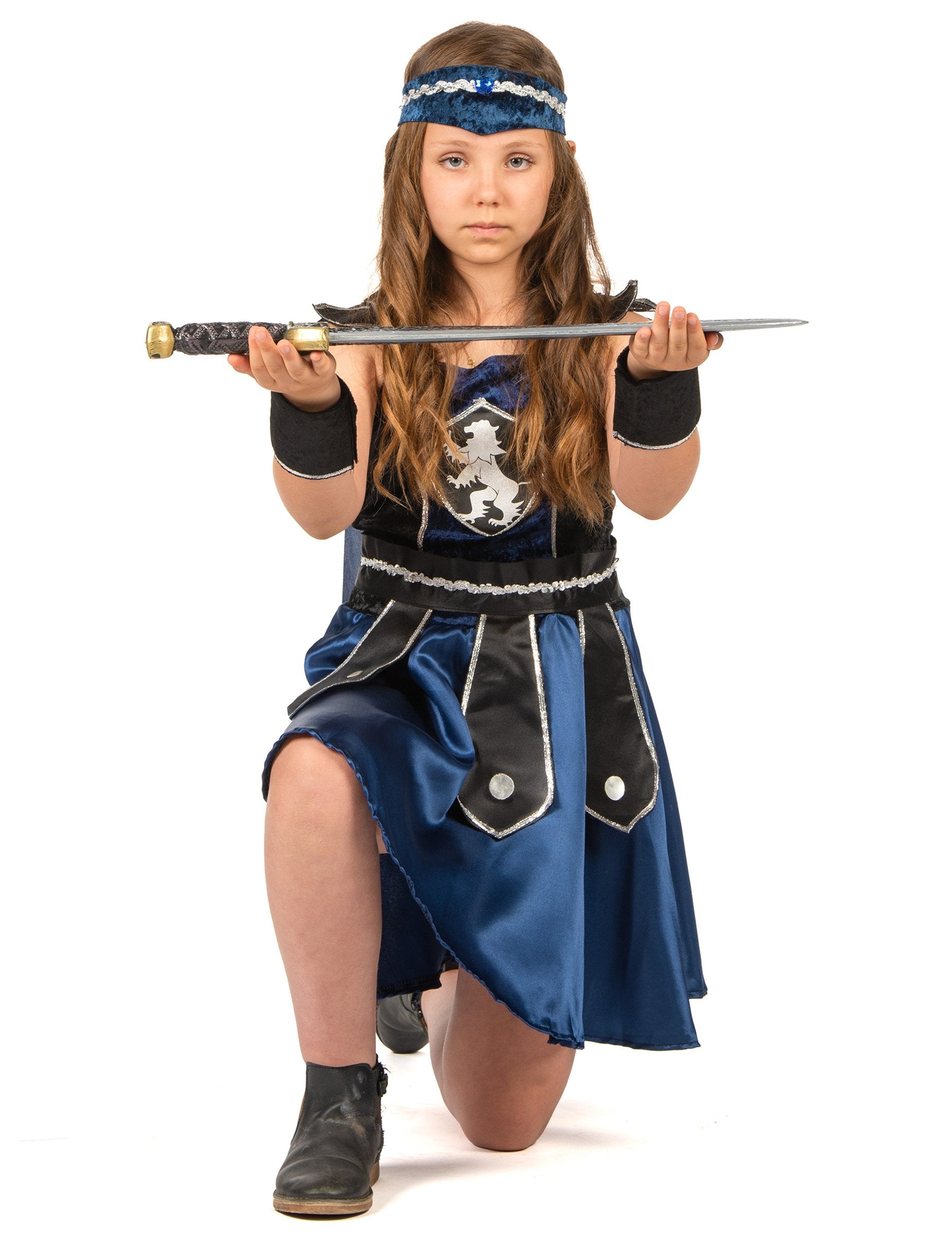 Ovaj vitezov prerušavanje za djevojku sastoji se od haljine, ogrtača, pari manžeta, pojasa i transparenta (cipele nisu uključene). Plava i crna haljina nalazi se u baršunastom efektu tkanine na vrhu, a saten na dnu. Sprem se šiva značka. Tamnoplavi ogrtač dolazi se ogrebotina na stražnjoj strani haljine. Remen je crn i srebrni, sa vrhovima sprijeda. Zatvara se pomoću velike ogrebotine. Efekt crne manžete Velvet također se zatvaraju pomoću ogrebotina. Elastični transparent je ponoćno plavo i srebrno. Ovaj viteški kostim bit će savršen za karneval.