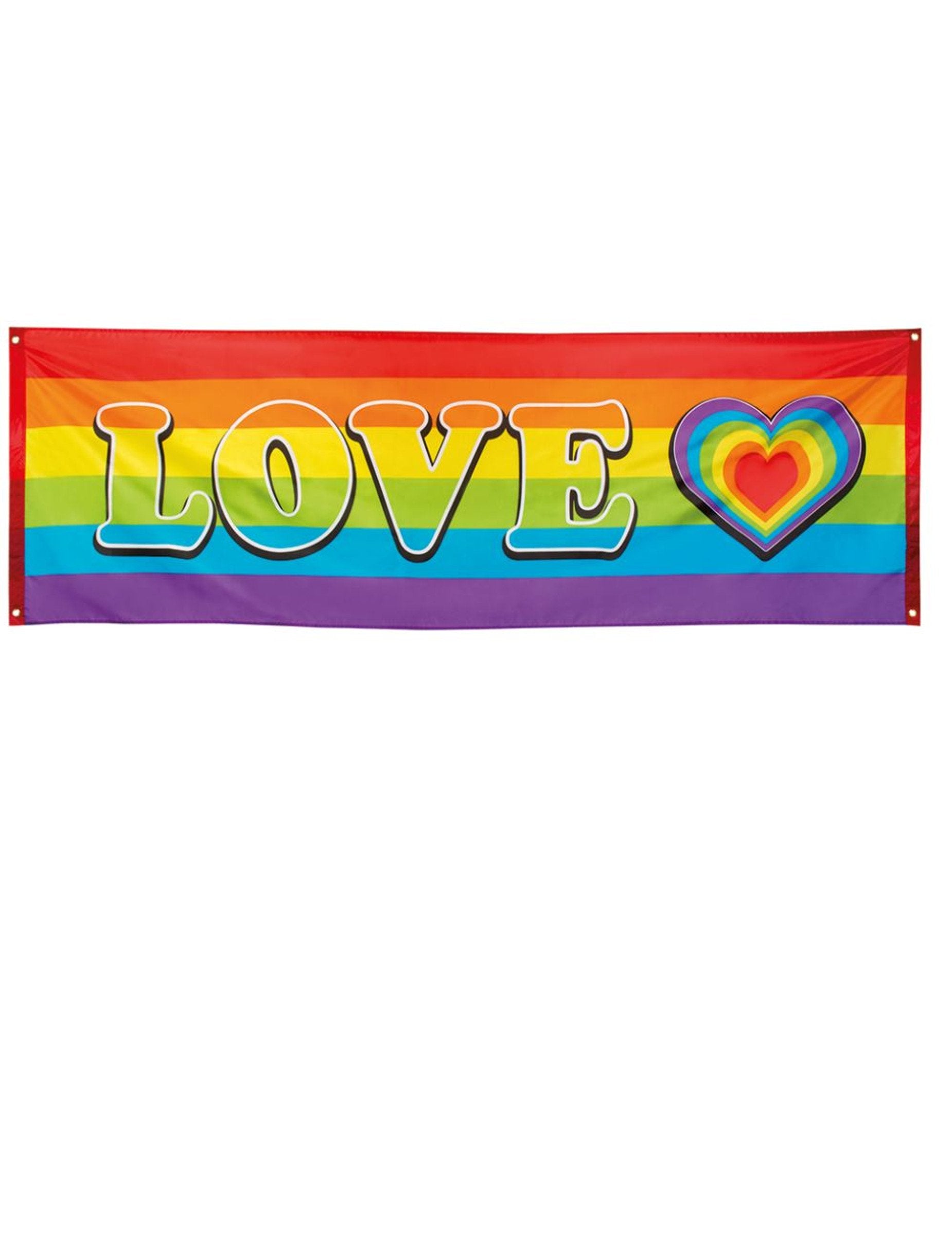Ovaj transparent ukrašen je raznobojnim bendovima s natpisom "Ljubav". Nalazi se u poliesterskom materijalu i mjeri otprilike 74 x 220 cm. Ima četiri eele kako bi ih lako mogli objesiti. Ovaj će transparent dati boju vašoj dekoraciji sobe tijekom večeri.