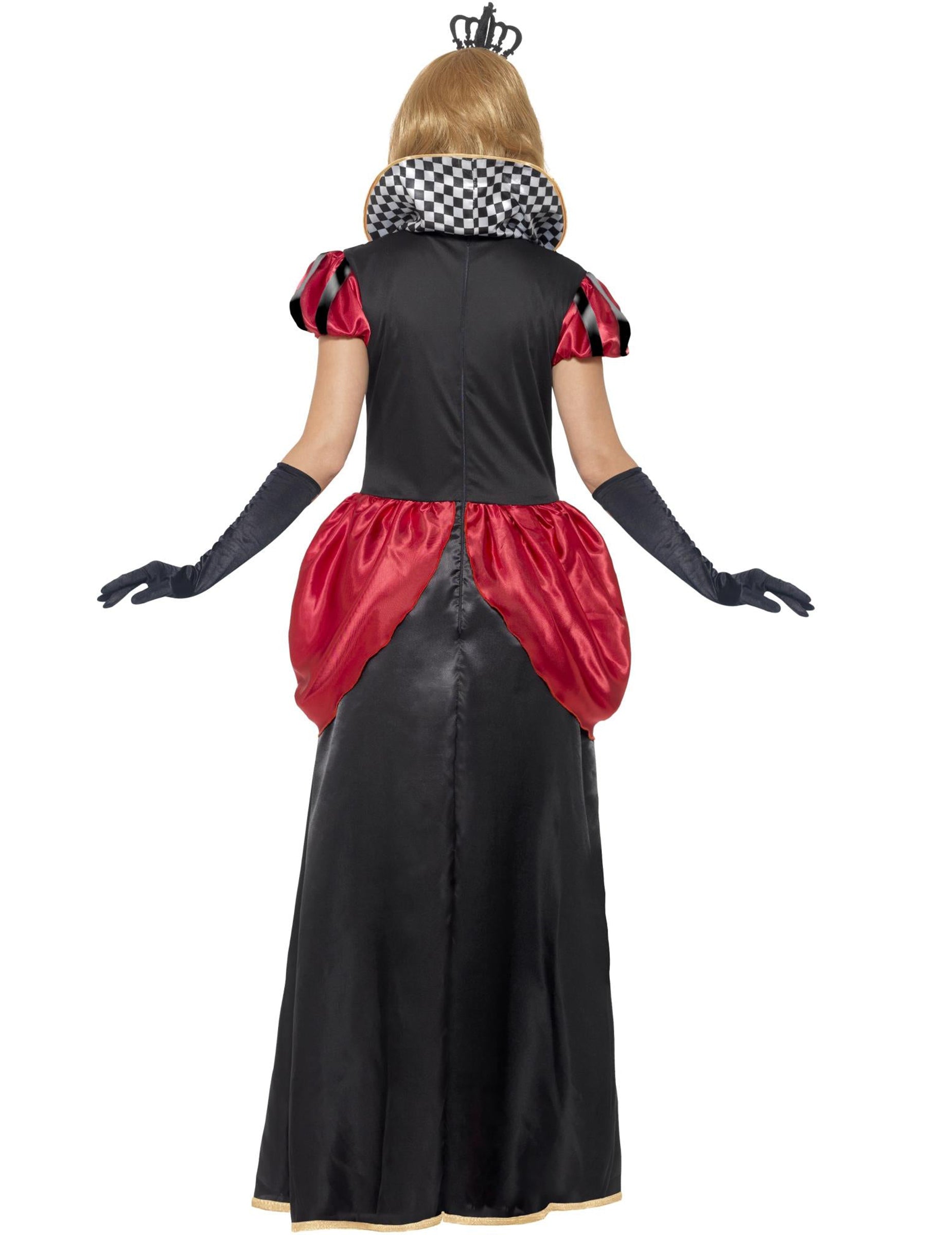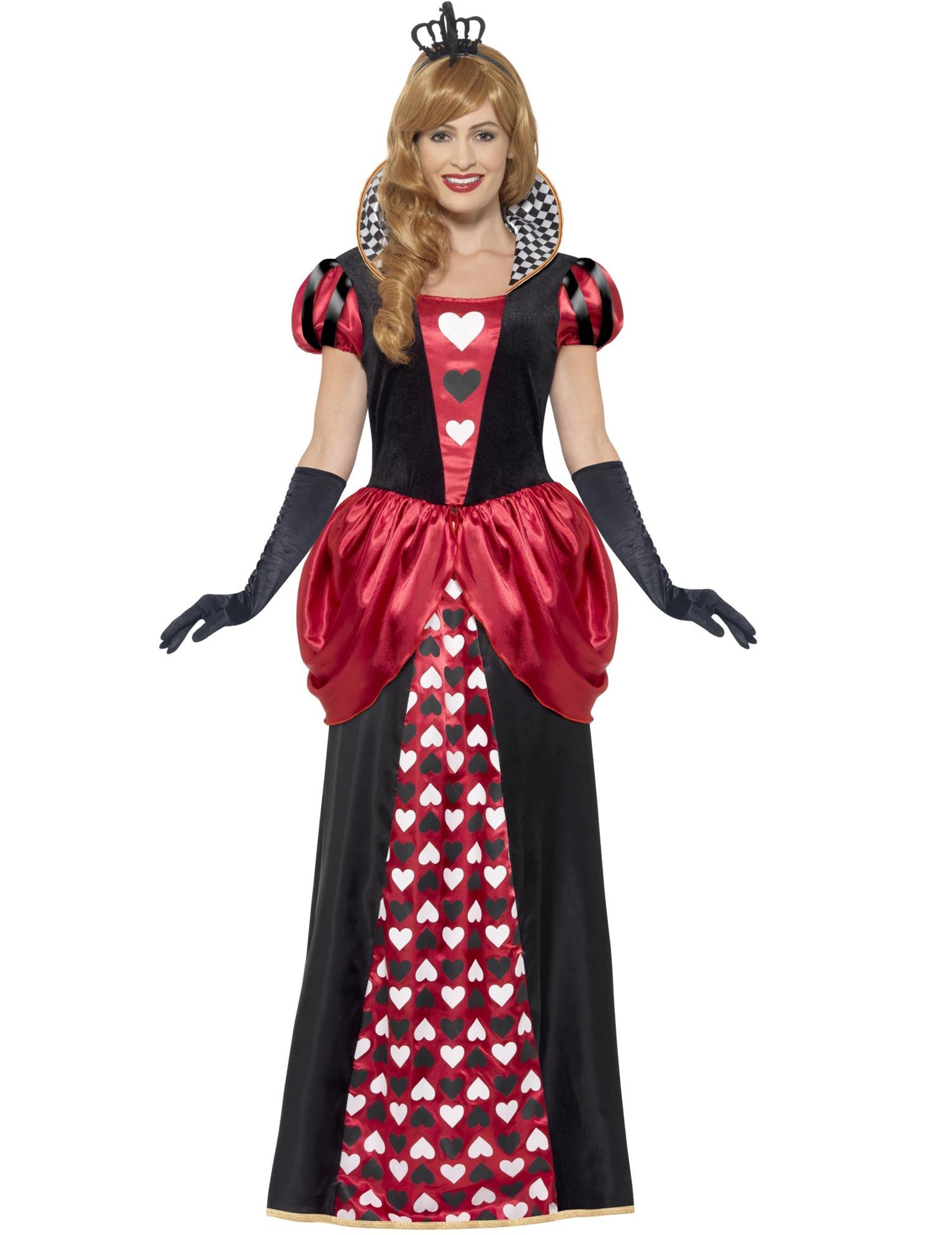 Ovaj kostim za kraljicu srca za žene sastoji se od duge haljine i trake za glavu. Gornji dio haljine nalazi se u baršunastom efektu tkaninu, dok je donji dio izrađen od satenske tkanine. Crno -bijela srca krase prednju stranu na sateno crvenoj pozadini. Kratki rukavi u crvenoj i satenskoj crnoj tkanini su natečeni. Ovratnik crno -bijele pločice pjena je da stoji ravno. Na bočnim stranama haljine prisutna je satenska crvena tkanina kako bi se stvorio natečeni učinak. Haljina se zatvara u stražnju stranu patentnim zatvaračem. Crna plastična traka za glavu nadvladala je kruna crne filca. Ova prerušavanje bit će idealna za utjelovljenje kraljice srca tijekom karnevala ili prikrivene večeri!