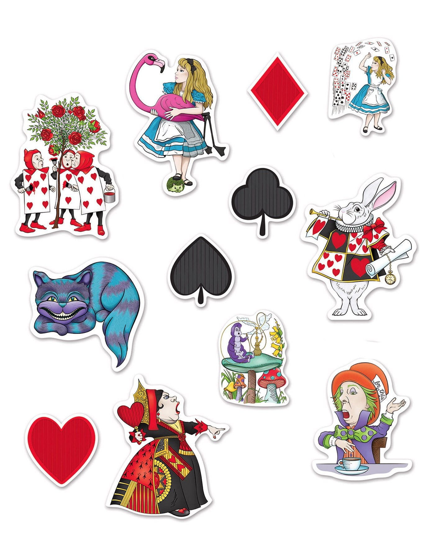 Ovaj set uključuje 12 kartonskih ukrasa. Na temu Alice u imaginarnoj zemlji, ovo parcela sadrži: - gusjenica na gljivicama - osoba s šeširima koji piju čaj - 4 simbola igara s kartama: lopatice, srce, pločice i djetelina - gadna kraljica koeura - Kunić s sat - plava i ljubičasta mačka - muškarci - Card Muškarci slikaju drvo ruža - djevojku u plavoj haljini s ružičastim flamingom - djevojčica s kišom od karata. Ovi ukrasi se tiskaju s obje strane i mjere se između 16 i 30 cm, ovisno o uzorku. Idealno za vaš stol ili unutarnji ukras povodom večeri na temu Alice u imaginarnoj zemlji.