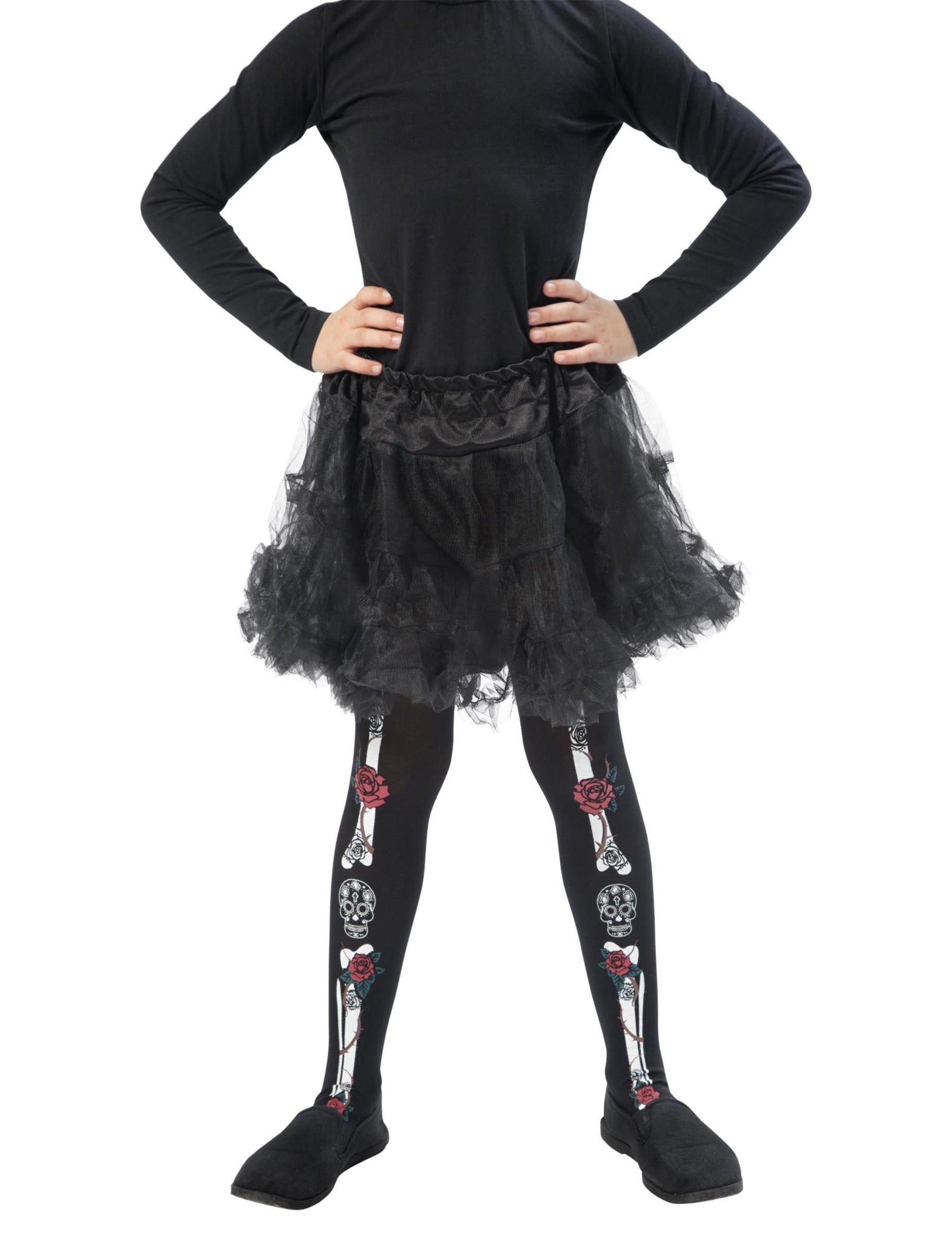 Ove tajice Dia de los Muertos za djecu su crne s bijelim kostima ispred. Crvene ruže i lubanja također su prisutni sprijeda. Oni su neprozirni. Ove tajice na temu meksičkog mrtvog dana savršeno završavaju prerušavanje na ovu temu ili za Noć vještica.