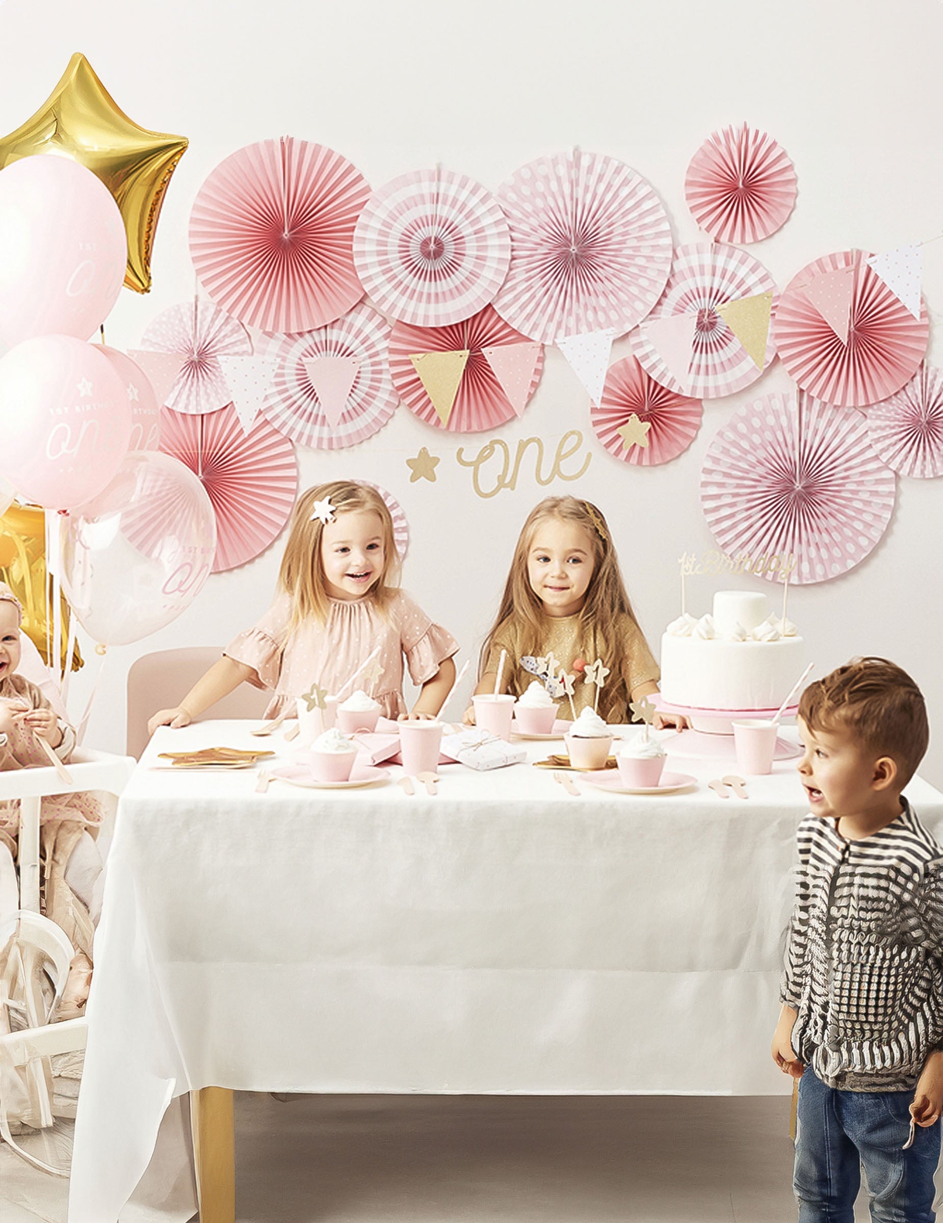 Dodajte dašak nježnosti svom događaju s ovim svijetloružičastim papirnatim rozetama u pakiranju od 3. Set sadrži veliku viseću rozetu promjera 40 cm s točkicama, srednju od 32 cm s prugama i manju od 23 cm također s točkicama. Jednostavno objesite svoje rozete pomoću priložene konopca za stvaranje modernog i prozračnog ukrasa za vjenčanje. Ove rozete su također idealne za ukrašavanje baby showera ili proslave rođenja.