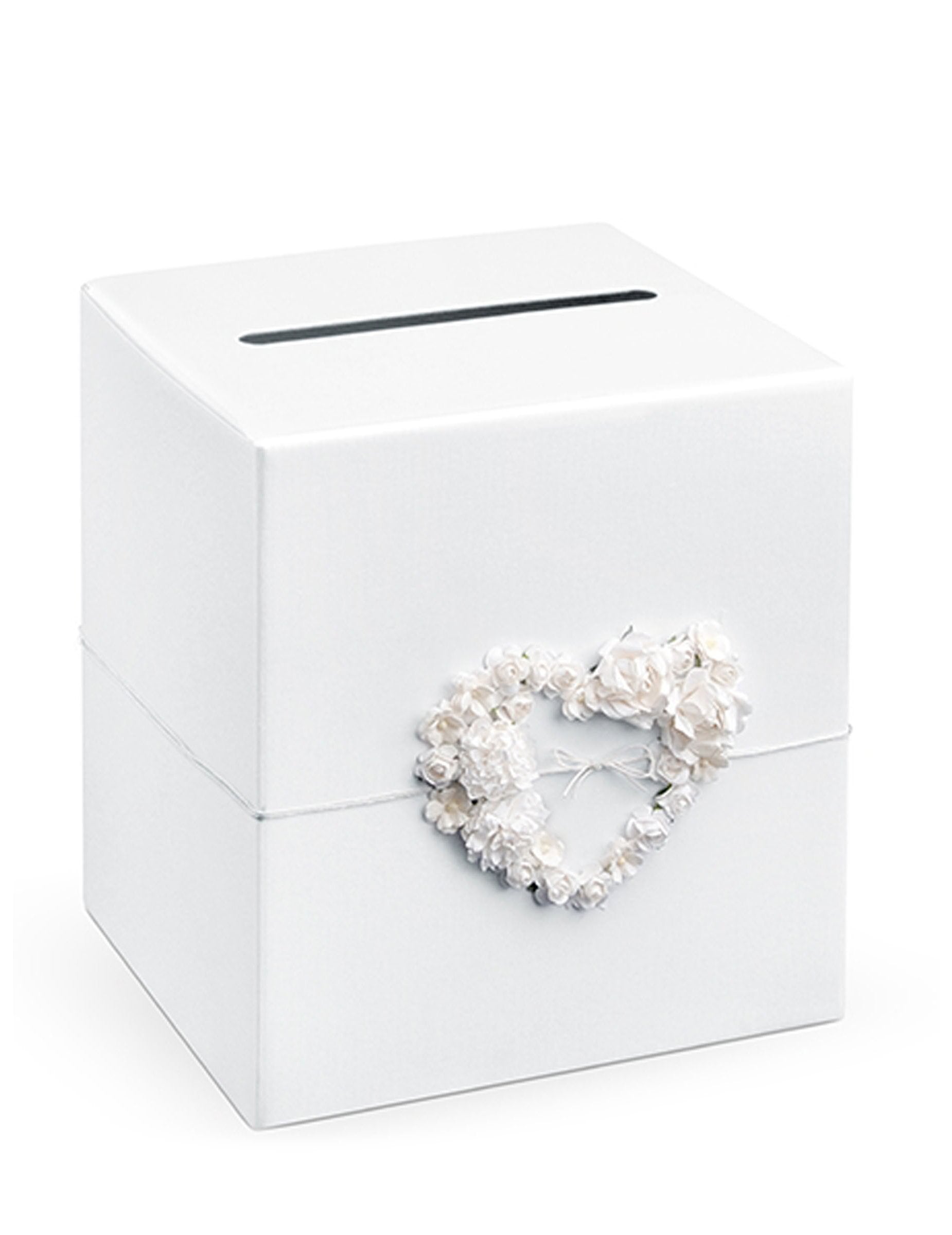 Ova bijela urna izrađena je od kartona. Mjeri otprilike 23,5 x 24 cm. Potpuno bijela, ukrašena je bijelim ružama od papira koje tvore srce na prednjoj strani (nije usredotočeno na urnu). Tanka bijela žica okružuje urnu. Na vrhu se pruža prorez tako da vaši gosti mogu tamo gurnuti koverte. Ova kutija je isporučena ravna, nekoliko će se sekundi biti dovoljno da ga sjednete! Ova bijela urna savršeno će se prilagoditi vašem ukrasu sobe za vaše vjenčanje!