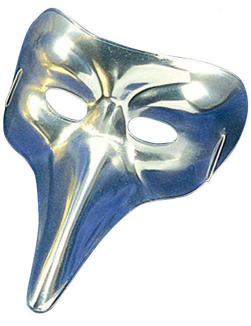Ova venecijanska maska srebrne boje pričvršćuje se elastičnom trakom. Ova maska je klasičan primjer s dugim nosom.