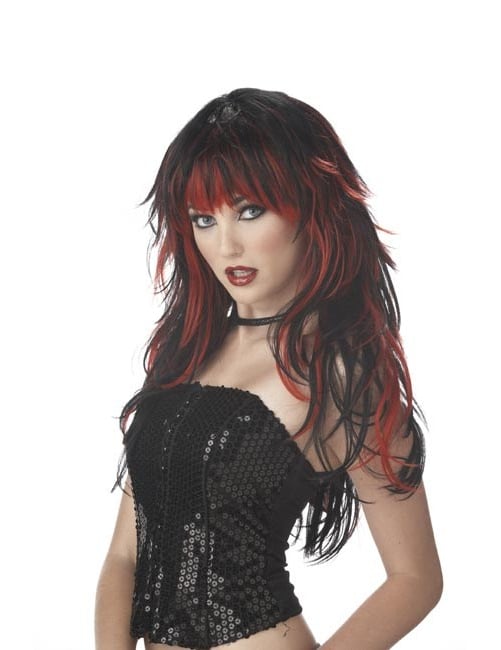 Ova gotička perika nudi dugu frizuru s fitima. Ima dugu kosu u crnoj i crvenoj degradiranoj fitilji s šiškama koje su skrivale čelo. Bit će savršeno dovršiti svoj gotički kostim tijekom Noći vještica!