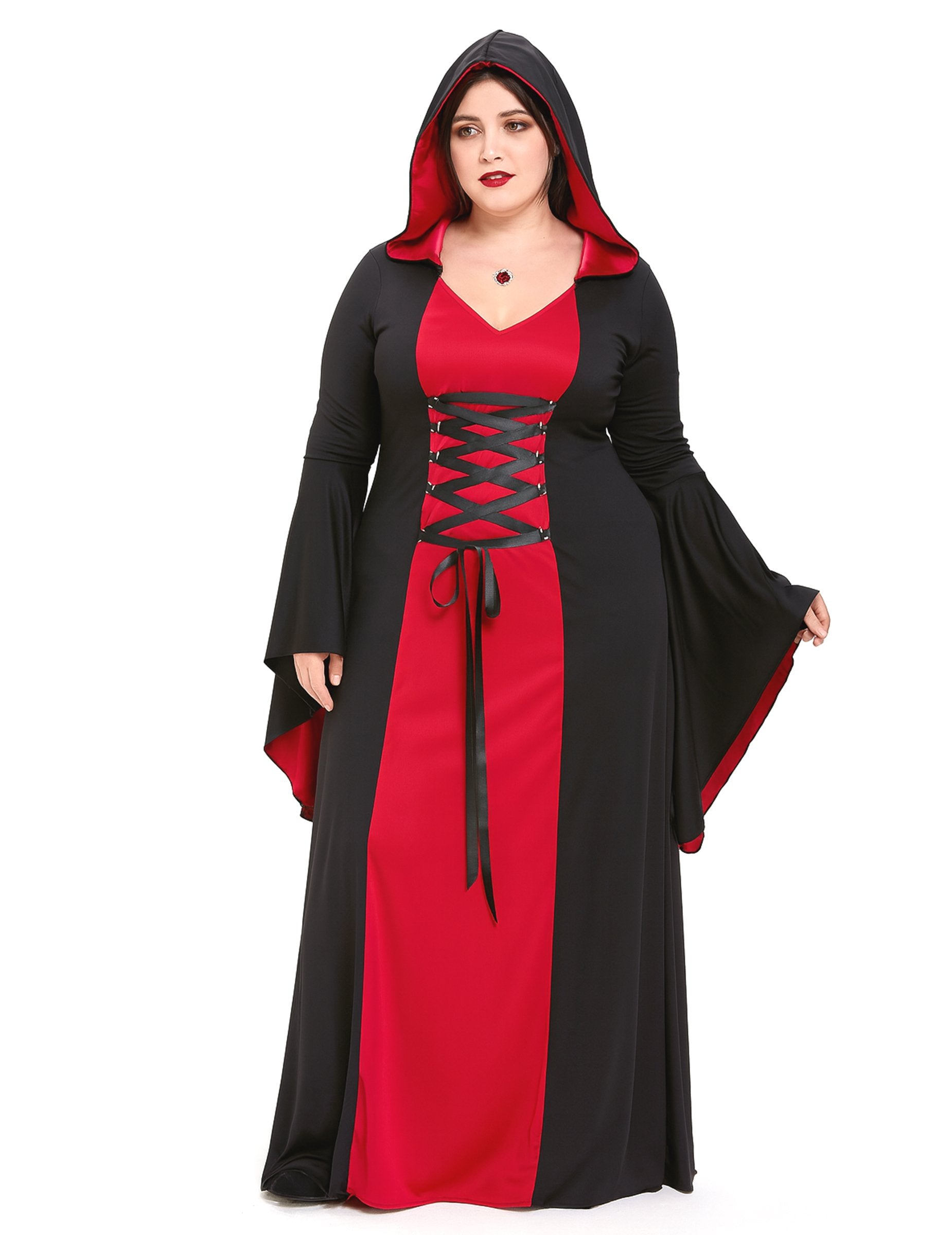 Ovaj srednjovjekovni kostim za žene sastoji se od haljine s kapuljačom. Ima vrlo golubova potučenog dekoltea i čipke za vezanje ispod prsa. Rukavi su mu široki i plamteni poput integrirane kapuljače. Usvojite crveni i crni pogled ravno iz 5. stoljeća! Ovaj srednjovjekovni kostim za žene idealan je za Noć vještica ili za srednjovjekovni festival.