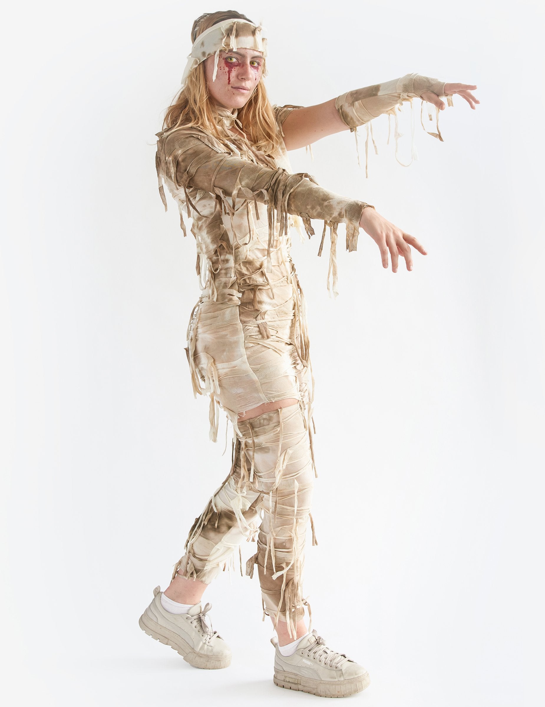 Ovaj mumija kostim za žene sastoji se od haljine, manžetne, trake za glavu i gamaša. Bež i bijela haljina nudi rastrgan stil, s istrošenim efektom, zahvaljujući komadićima viseljenog bijelog izgleda koji visi nad ovom haljinom. Bit će idealno za utjelovljenje mrtvaca ili egipatske mumije. Traka za glavu, gamaše (koje su različite veličine za stil čišćenja) i manžetna dovršavaju seksi i zastrašujući učinak ovog kostima. S ovom prerušenom mumijom bit ćete najseksepilniji od večeri za Noć vještica ili za večer na temu Egipta ili antike
