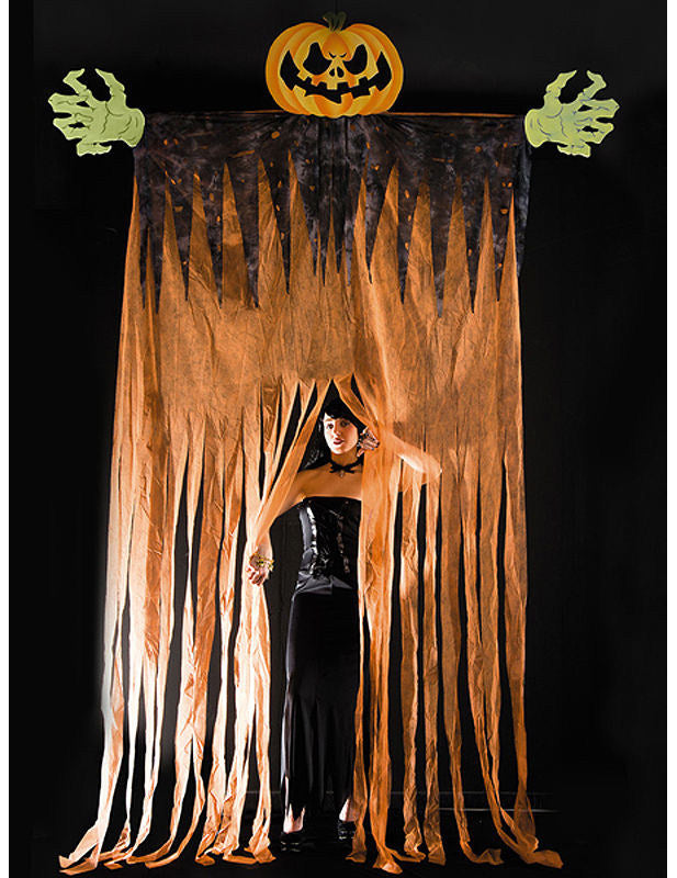 Ovaj ukras vrata predstavlja ogromnu bundevu s razdvojenim rukama. Mjeri oko 350 cm. Ovaj ukras vrata od bundeve bit će savršen za presvlačenje vašeg ulaza na dan Noći vještica.