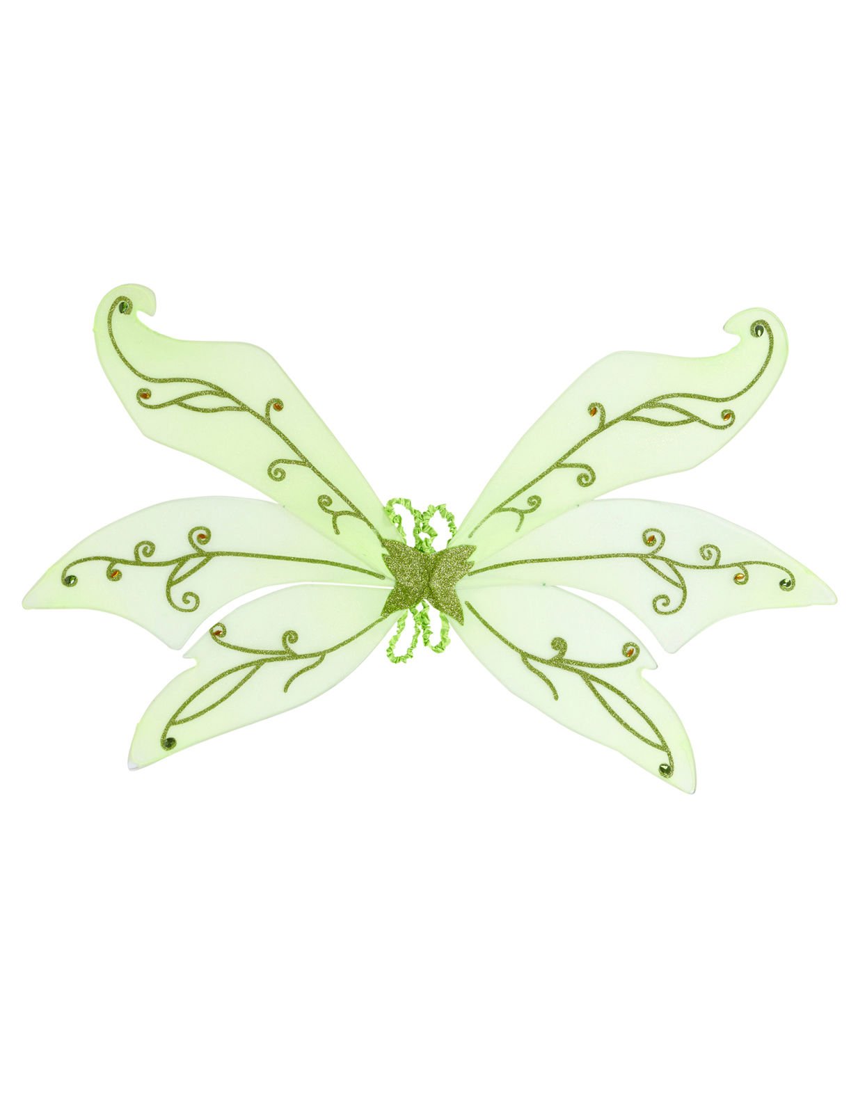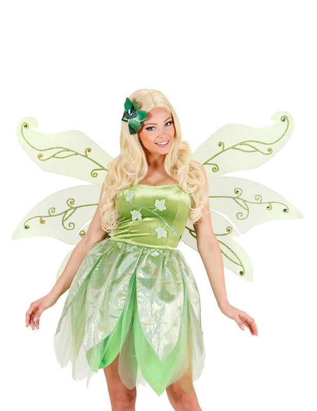 Ova zelena vilinska krila mjere otprilike 106 x 72 cm. Simetrična krila su u svijetlo zelenoj tkanini. Ukrašeni su prekrasnim svjetlucavim uzorcima. Zahvaljujući dva naramenica, krila se lako nose kao ruksak. Za elf, bajkovitu ili leptir kostime, ova velika vilinska krila idealni su dodatak za prikrivene događaje.