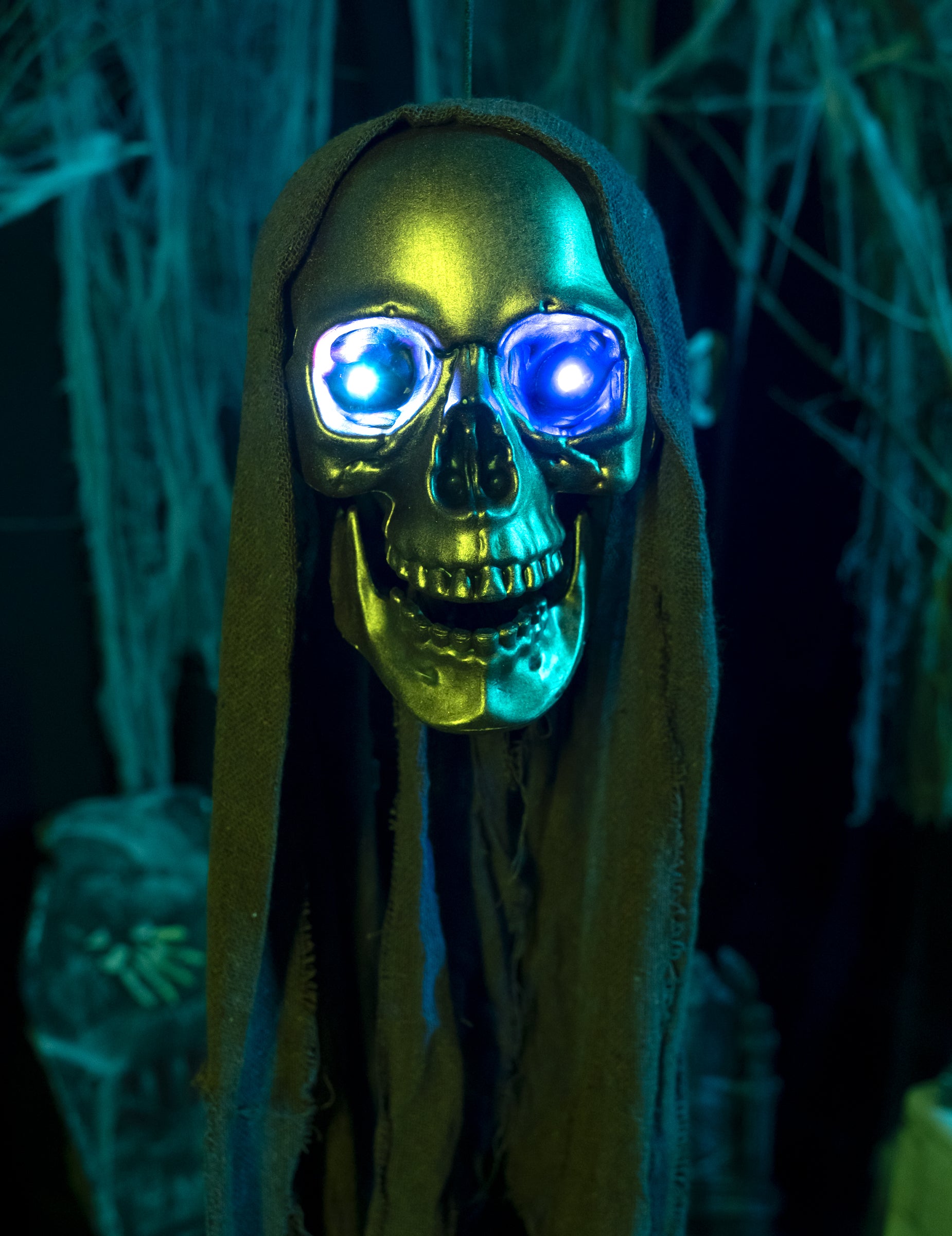 Evo izvrsne glave kostura s patinom koja podsjeća na istrošeni bakar. Sa svojim poderanim velovima i širom otvorenim čeljustima, sigurno će mnoge prestrašiti. Njena najbolja značajka? S 3 priložene LR44 baterije, ukras će bljesnuti očima svih boja. Prizor koji bi mogao prestrašiti i najzahtjevnije oko ako se ukras nalazi u vrtu noću. U noći vještica, pustite mašti na volju i stvorite zastrašujući ukras koji će vašim prijateljima poslati trnce niz kralježnicu!