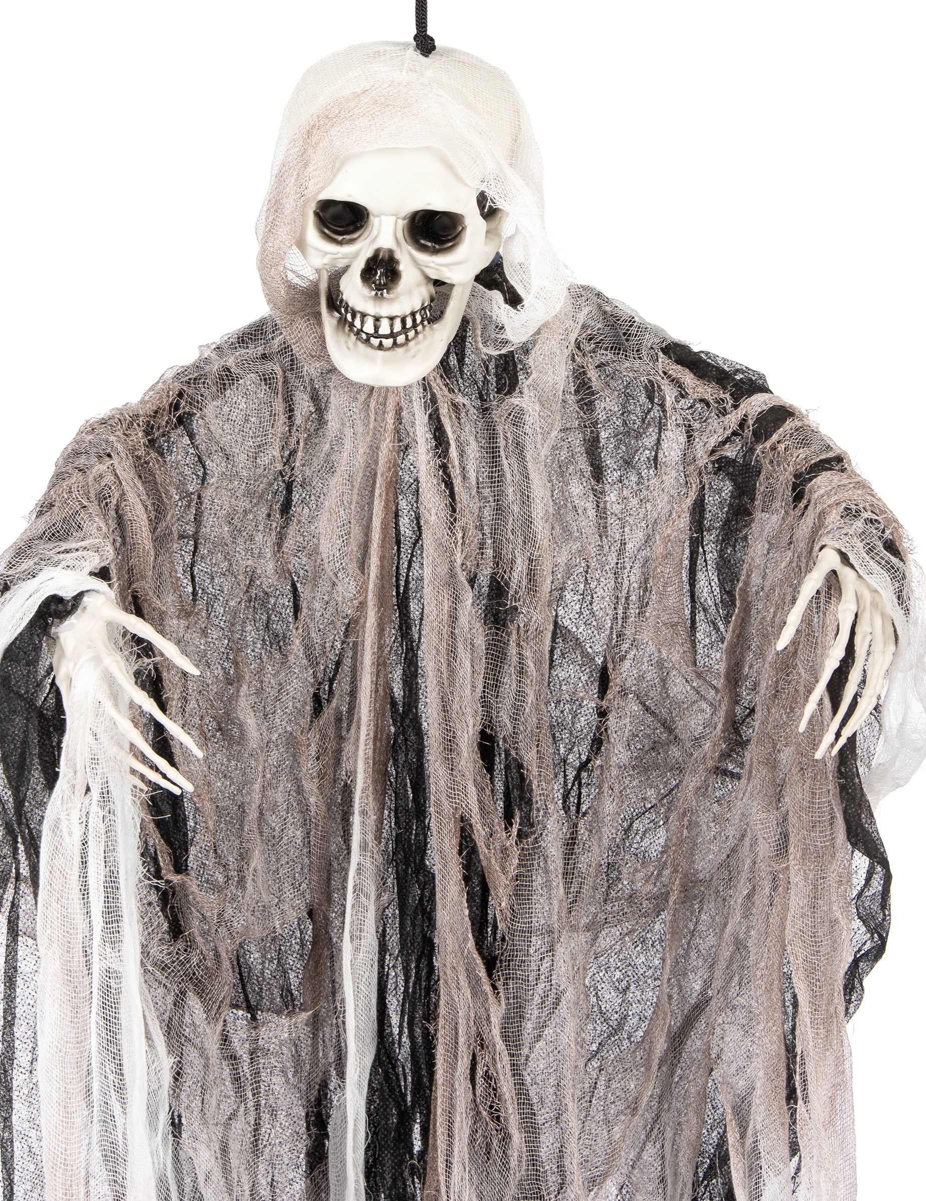 Ovaj viseći kostur od 1 metra idealan je za stvaranje zastrašujuće scene tijekom vaših svečanosti o Noći vještica. Njegova grimasna lubanja, skeletne ruke i višestruko rastrgane zavjese tvore siluetu koja, čini se, izlazi iz noćne more. Obložene tkanine u tamnim nijansama pojačavaju spektralni učinak. Lagan i jednostavan za objesiti, ovaj će dekor biti savršen za doček vaših gostiju u tmurnoj atmosferi.
