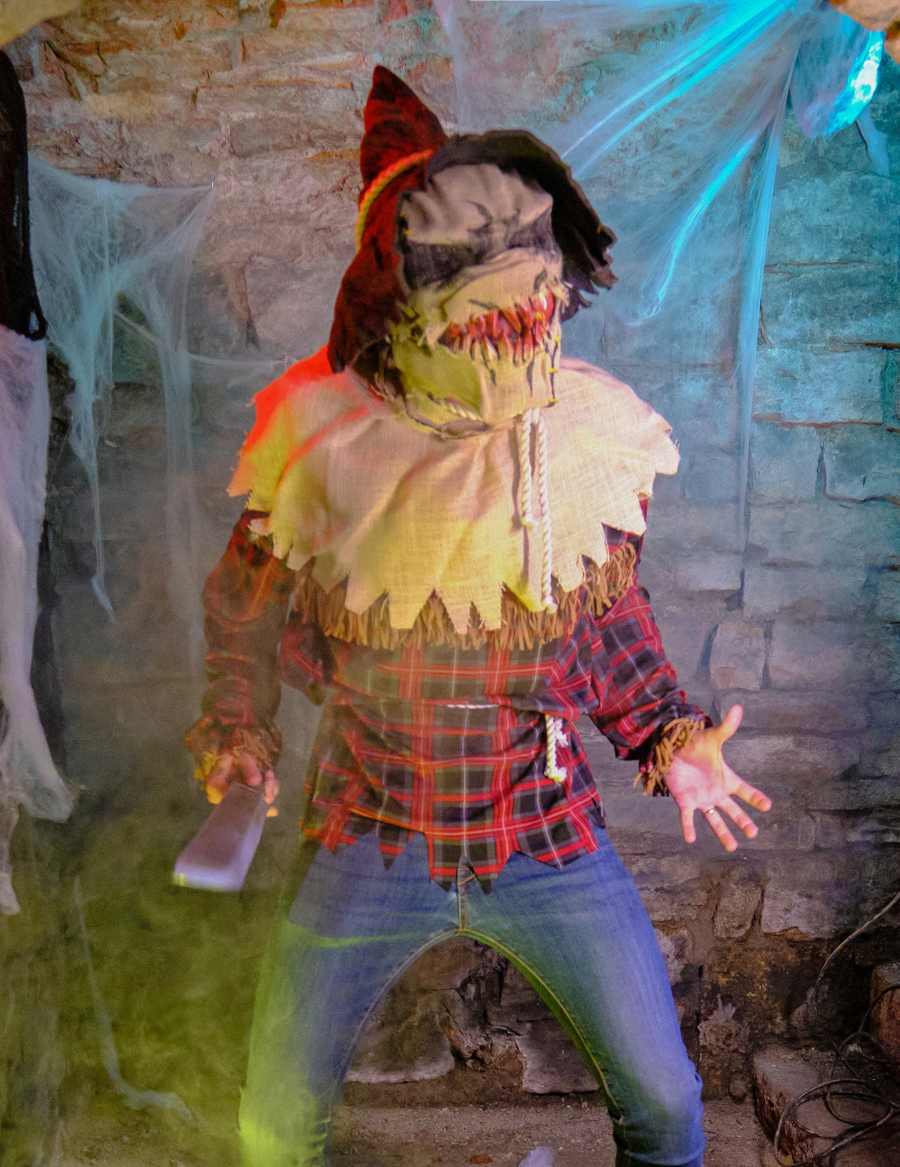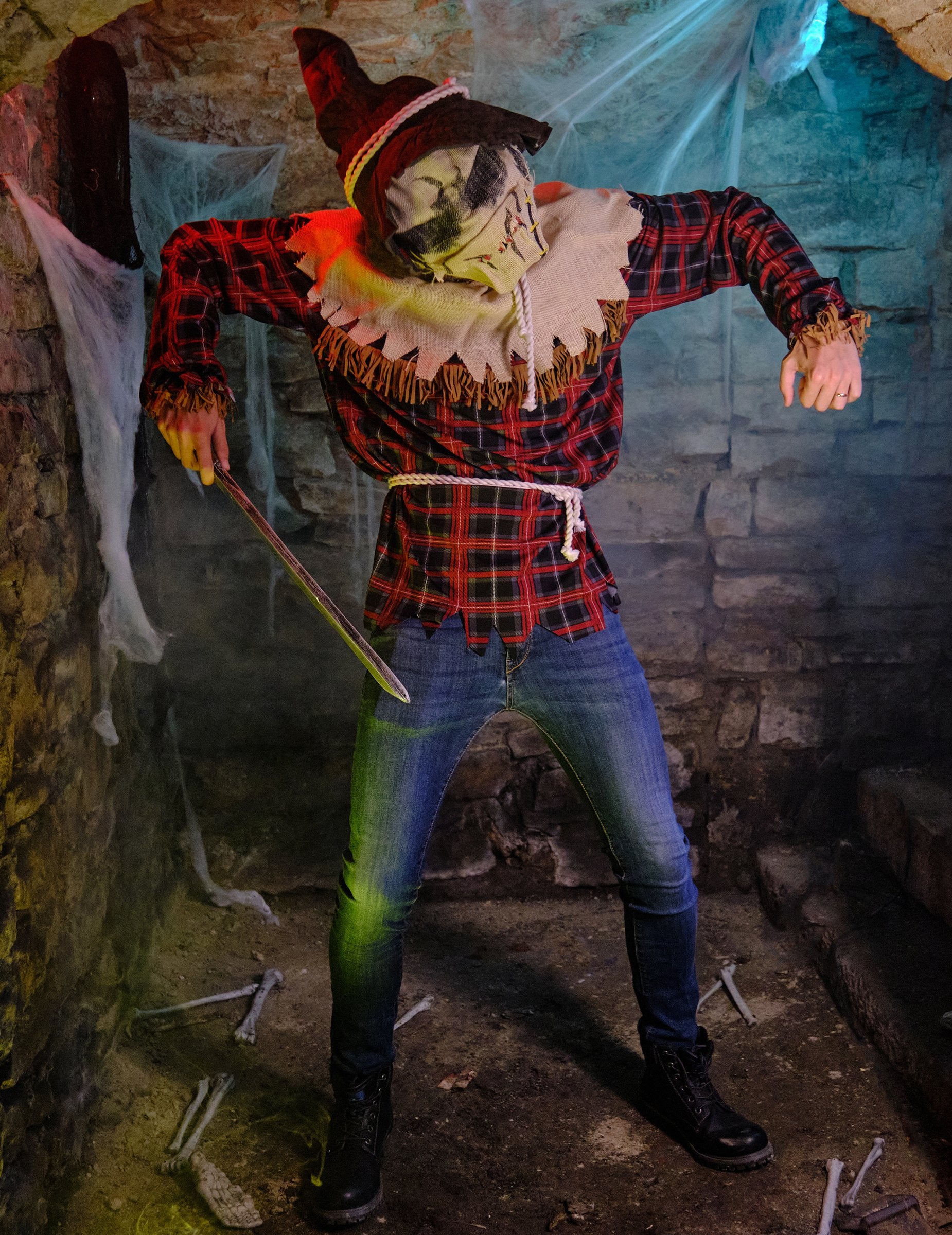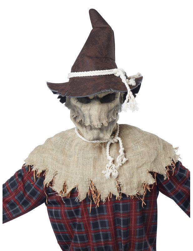 Ovaj poliesterski kostim za muškarce sastoji se od tunike, maske i šešira. Crvena i plava provjerena tunika ima duge rukave. Pojas u konopcu veže se u struku. Ovratnik je izrađen od imitacije za realan učinak. Smeđi šiljasti šešir s ukrasom konopa i maska dovršava odjeću. Maska, ani-motion predstavlja glavu zastrašujućeg strašila. Kad otvorite čeljust, maska će se također pomaknuti, otkrivajući krvave oštre zube. Uz ovaj kostim za muškarce za muškarce, izgledat ćete kao da ste izašli ravno iz horor filma! Idealan je za Noć vještica ili tematsku zabavu.