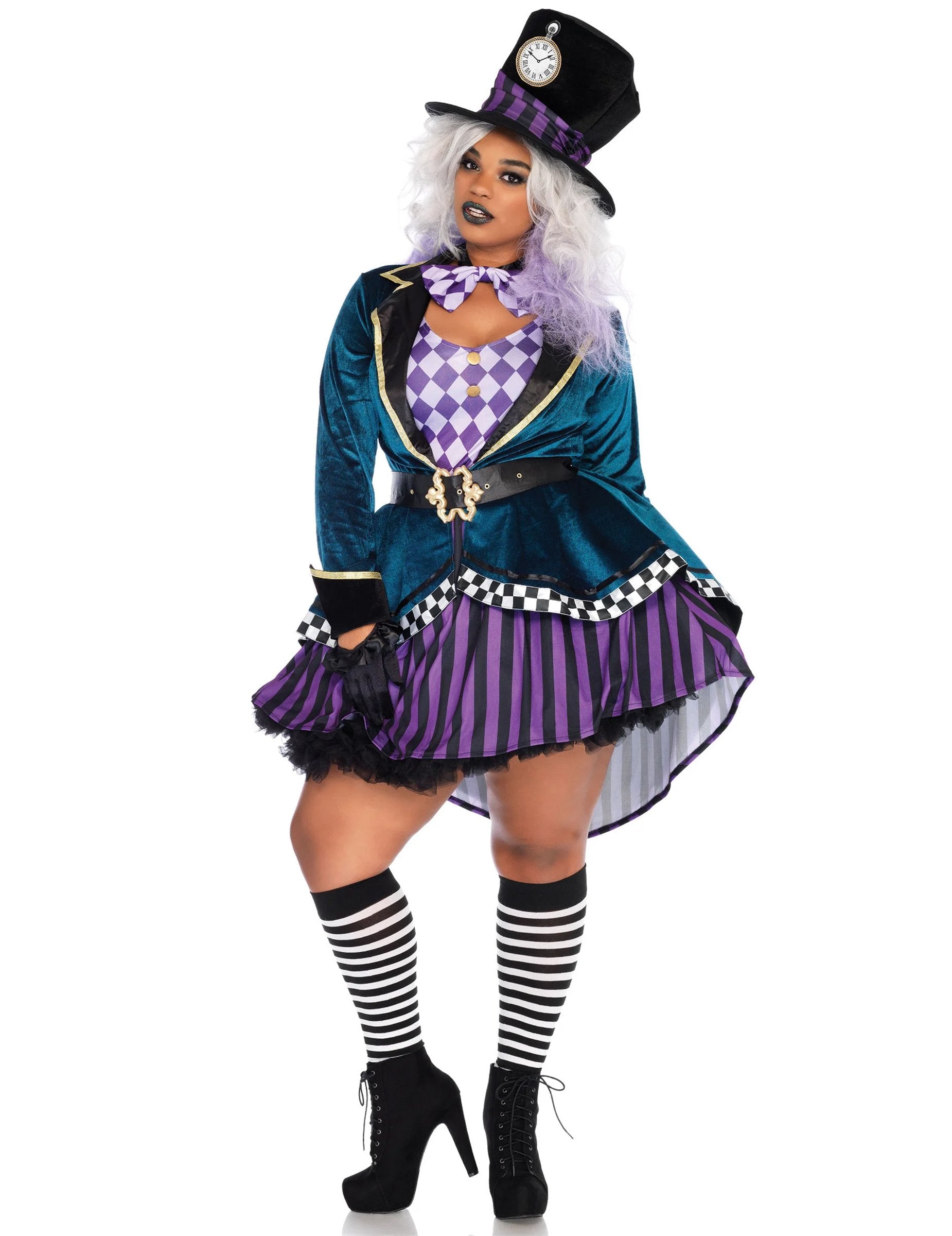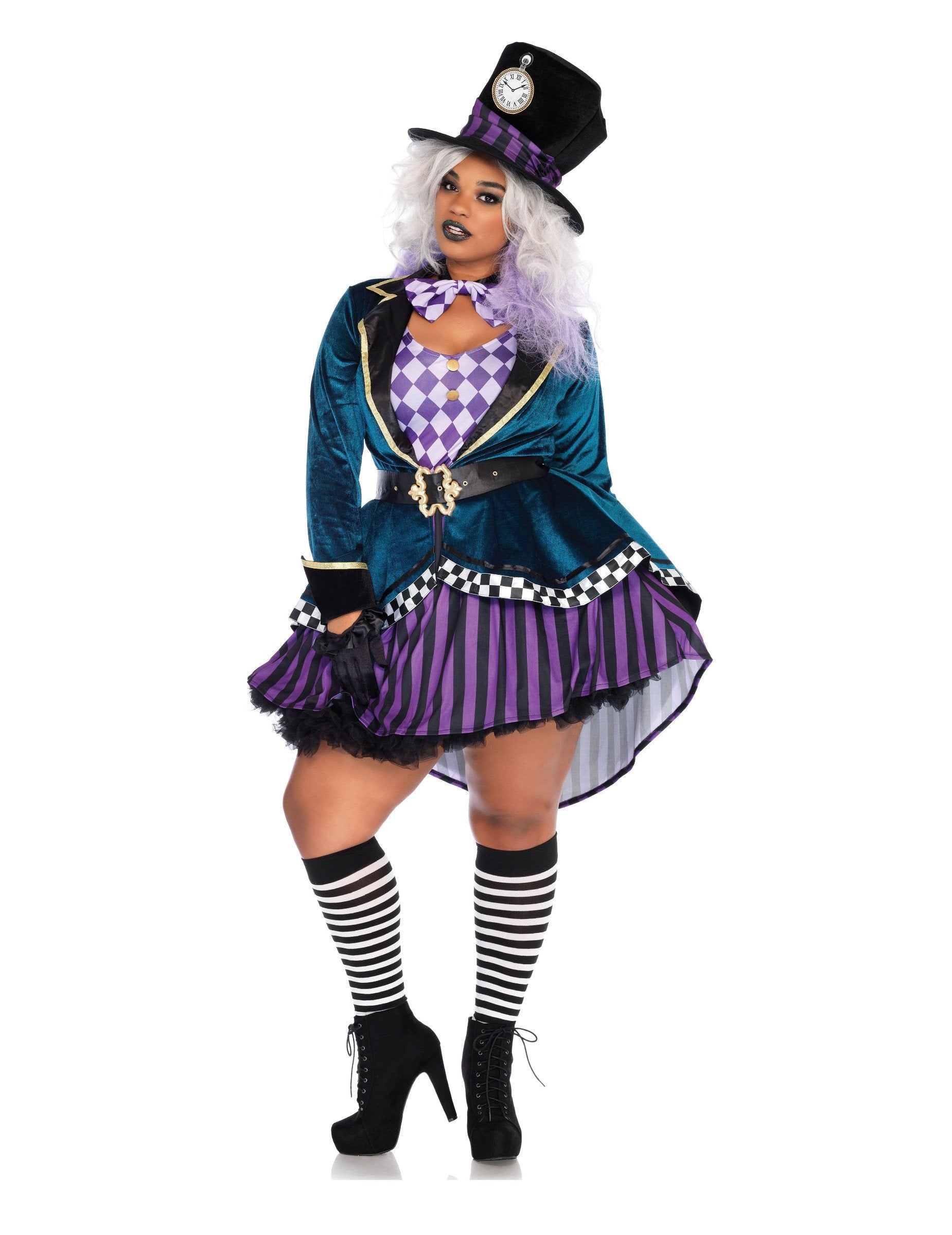 Ovaj kostim za žene sastoji se od haljine, kravata s lukom, pojasa i šešira. Crni gornji šešir ukrašen je trakom od tkanine s crnim i ljubičastim prugama i značkom koja predstavlja džepni sat. Luk kravata u nijansama ljubičica ima dijamantski otisak, usredotočuje se s ogrebotinom. Haljina se zatvara u stražnju stranu patentnim zatvaračem. Vrh će dati iluziju da nosite patku plavu repnu jaknu; S tkaninom s izgledom baršuna, iznad vrha s pramčanom kravate. Vrat jakne i rukavi su crni saten sa zlatnom obrubom. Dno jakne ukrašeno je crno -bijelom kariranom vrpcom. Asimetrična suknja s crnim i ljubičastim prugama premašuje jaknu. Pojas sa zlatnom baroknom petljom donijet će konačni dodir u odjeću. Ovaj kostim Hatter bit će savršen za karneval.