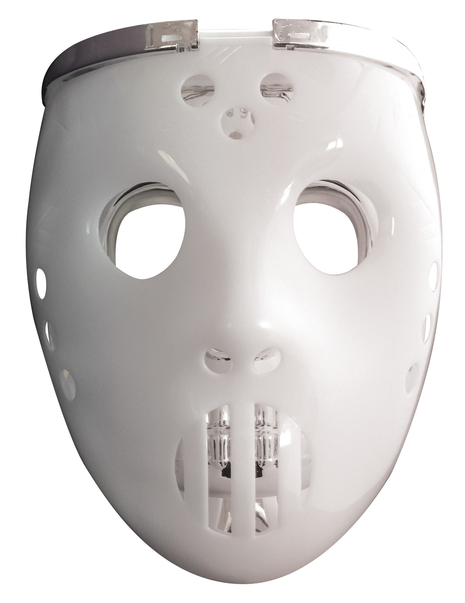 Ova hokejaška maska je svijetla i bijela (navedene su 2 CR2016 baterije). Održava ga elastika. Rupe u oku, nosu i ustima omogućit će vam da lako dišete. Pored toga, oblik maske i rešetke koja skriva usta prisjećaju se maske poznatog ubojice. Osim što je svijetla, ova maska ima posebnost skrivanja druge maske! Doista, možete podići hokejsku masku, a ispod nje je lubanja koja se pojavljuje! Ovaj dodatak bit će savršen za dovršavanje vaših serijskih ubojica i davati strah od svog života svojim prijateljima, tijekom Noći vještica ili zabave prerušene na temu užasa.