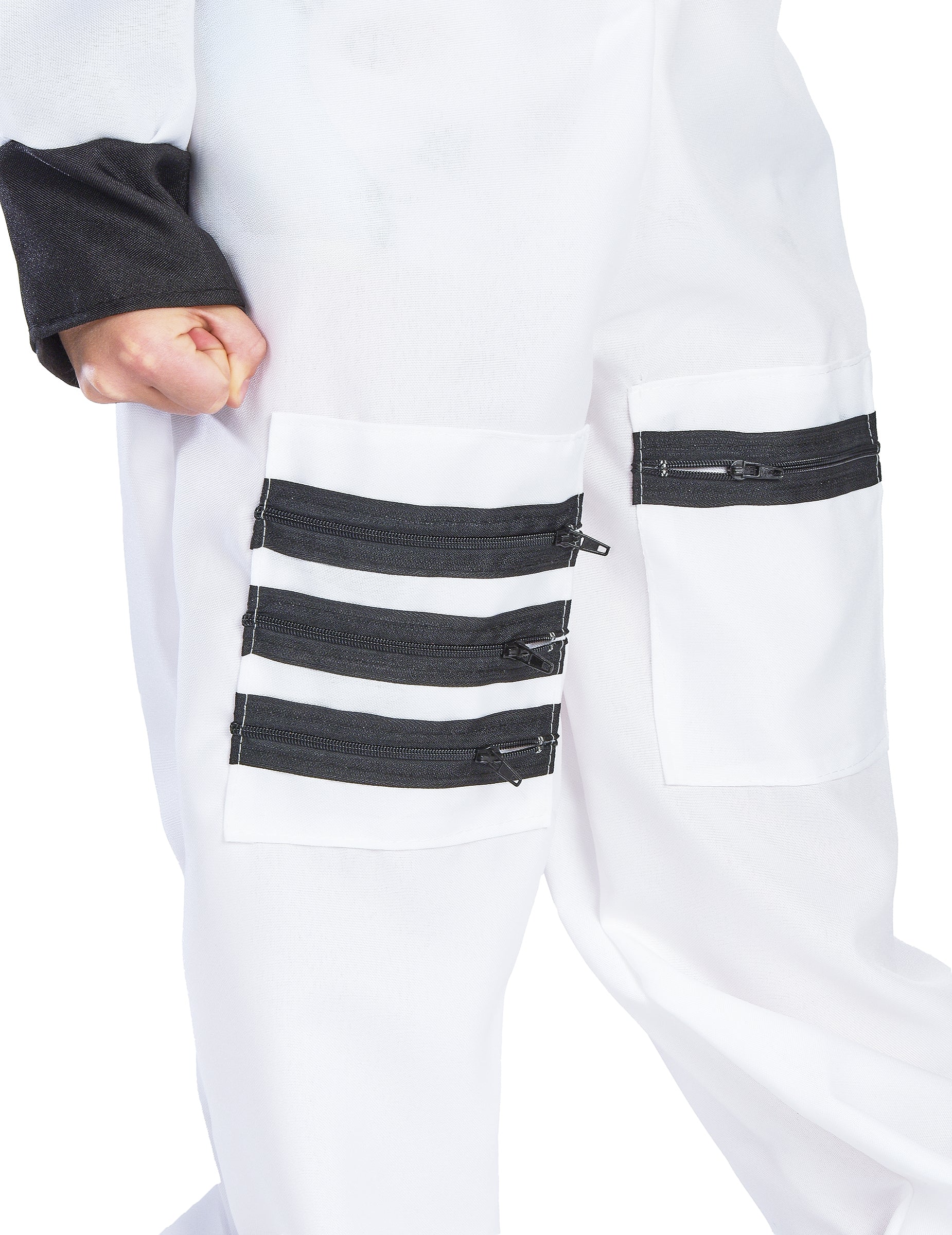 Ovaj kostim za djecu astronauta sastoji se od bijele kombinacije dugog uboda ukrašene NASA značkama na poprsju i rukavima. Lažni naramenice i crni pojas krase vrh odjeće i ima veliki broj džepova. Kombinacija ima patentni zatvarač na prednjoj strani, što će omogućiti vašem djetetu da ga lako stavi. Uz ovaj astronaut kostim, vaše će dijete imati glavu u zvijezdama na Dan karnevala.