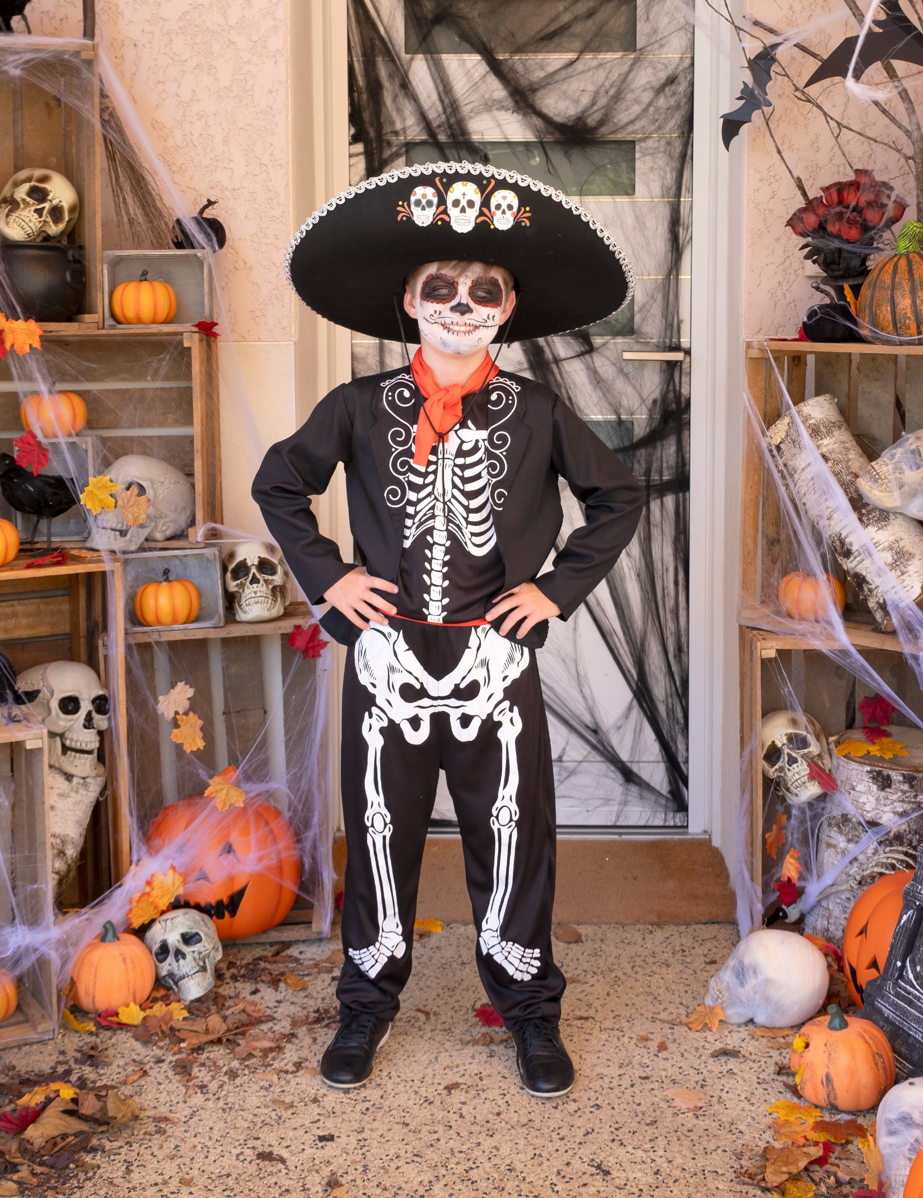 Ovaj kostur kostura los muertos kostim sastoji se od bandane, kombinacije, jakne i pojasa. Crna jakna ukrašena je bijelim otiscima na prednjoj strani. Crvena bandana odgovara pojasu koja će biti vezana u struku. Odlučite se za ovaj kostur kostura skeleta Los Muertos za dječaka za Noć vještica.