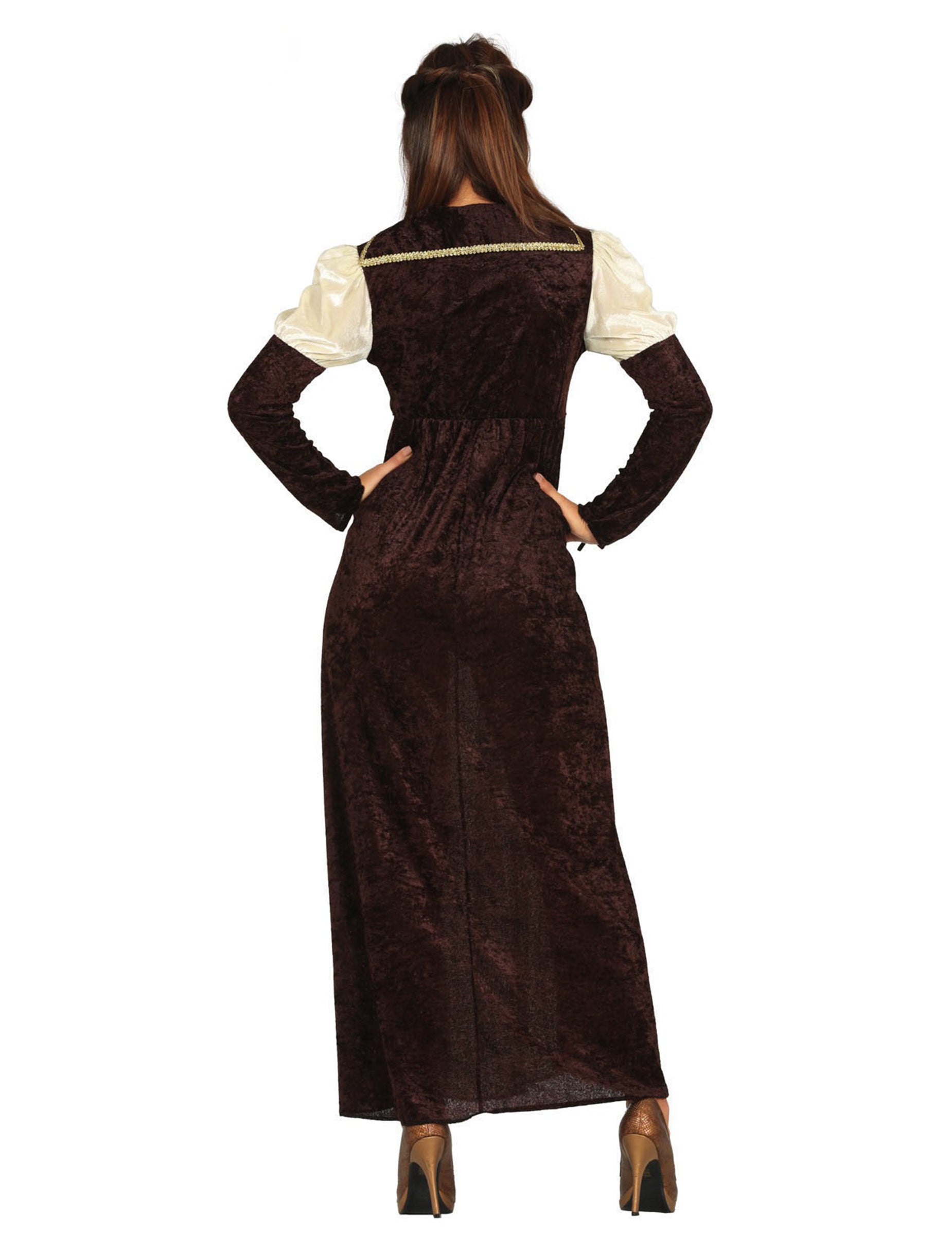 Ova srednjovjekovna kostim princeze sastoji se od haljine koja pada na gležnjeve. Haljina je uglavnom sačinjena od tkanine sa smeđim baršunastim efektom. Dugi rukavi su natečeni s ramenima i izrađeni su od bež tkanine koja se prisjeća na prednjem dijelu suknje. Zlatna veziva završavaju ukrašavanje ove raskošne haljine princeze (kruna nije uključena). Oživite vrijeme srednjeg vijeka, stavljanjem ovog princeze za srednjovjekovni događaj ili prikrivenoj večeri.