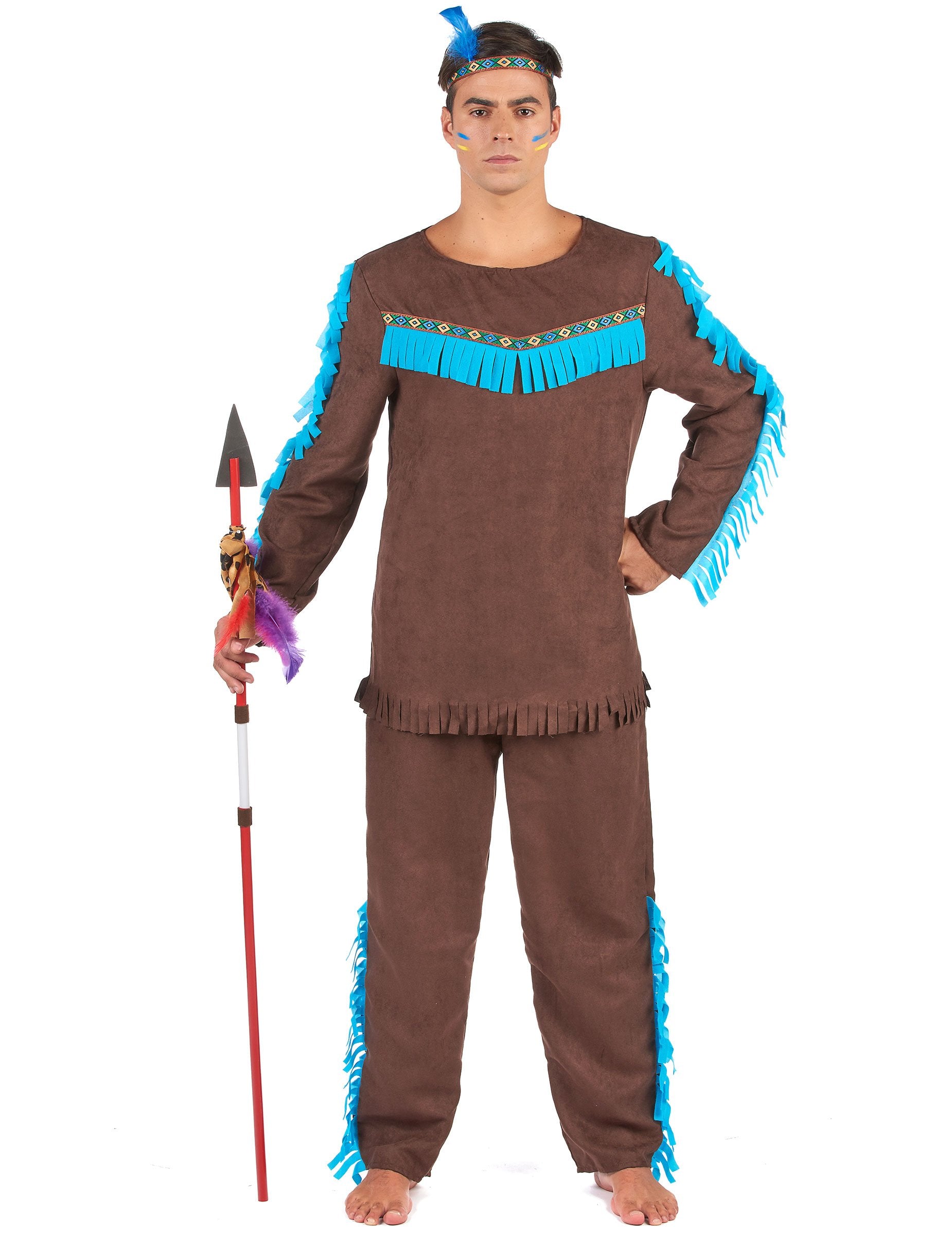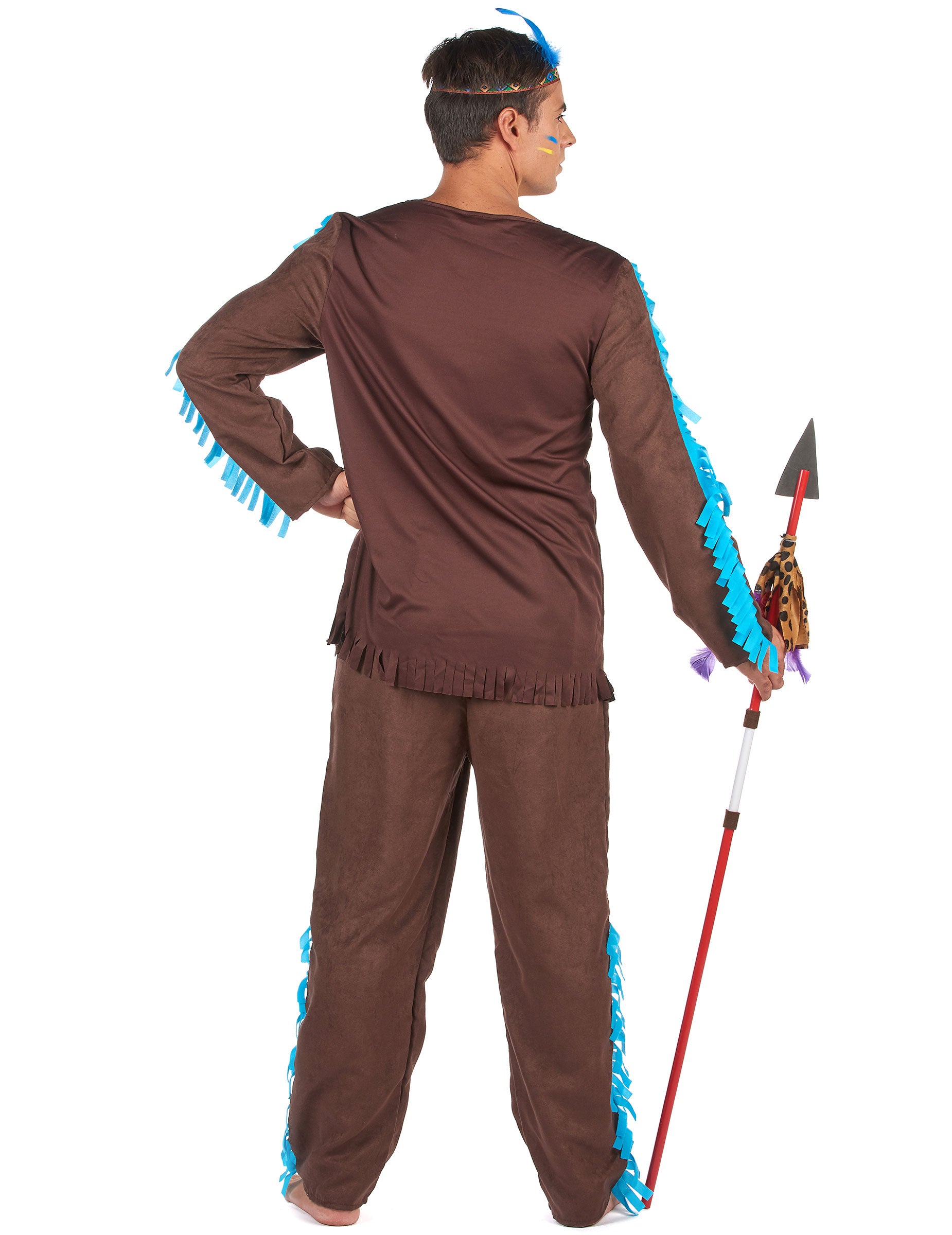 Ovaj indijski muški kostim sastoji se od hlača, vrha i trake za glavu. Hlače su smeđe s plavim rubovima na stranama. Visoka smeđa poput hlača ukrašena je etničkom obrubom i rubovima na poprsju. Traka za glavu ukrašena je plavim perom. Napravite naredbu, na sljedećoj prerušenoj zabavi igrajući odvažnog indijskog ratnika.
