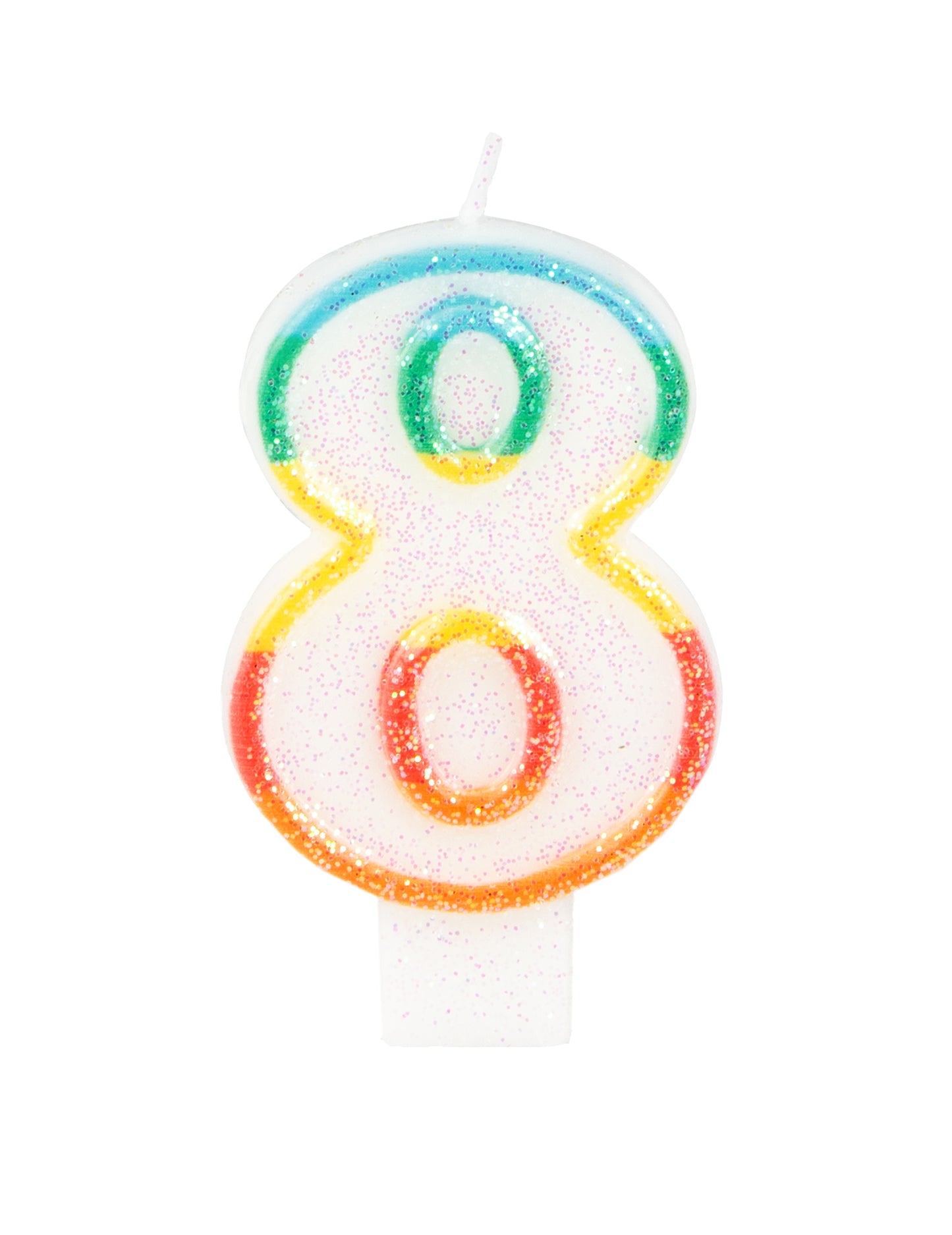 Ova godišnjica svijeća Slika 8 je u vosku i mjeri otprilike 7,5 cm. Bijela ova svijeća okružena je šarenom trakom. Također je posipana sjajem za svečano prikazivanje! Ova će se svijeća lako saditi na vašu tortu kako biste osvijetlili svoju rođendansku večer! Sama ili u kombinaciji s drugim, ova će svijeća biti savršena za proslavu živahne zalogaje ili godišnjicu vjenčanja!